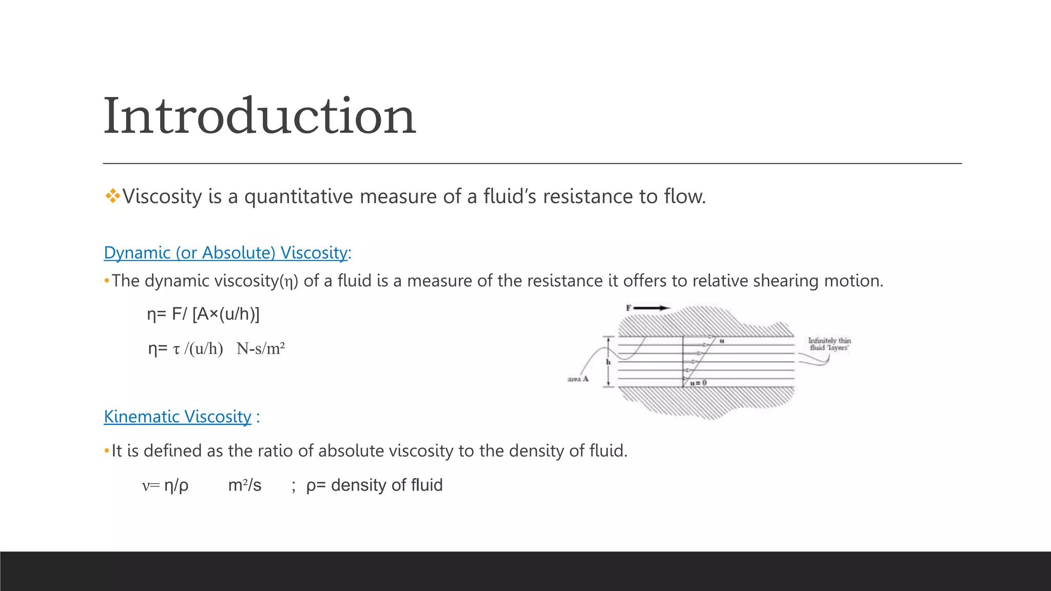 •The dynamic viscosity(η) of a fluid is a measure of the resistance it offers to relative shearing motion.