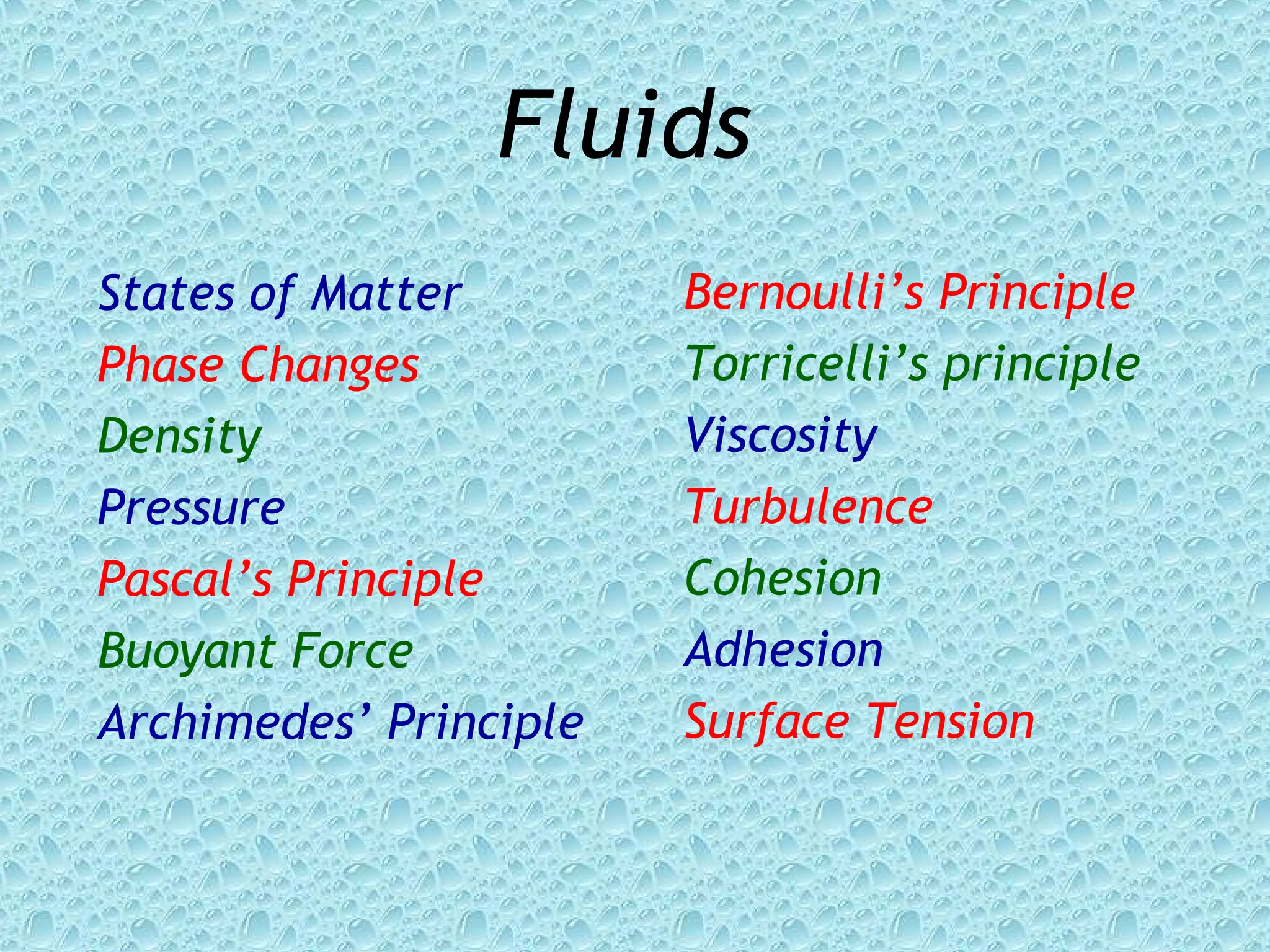 1) States of matter, phase changes, density, pressure, and Archimedes' principle.