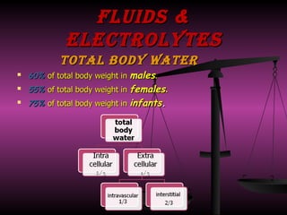 The document discusses fluid and electrolyte therapy under the supervision of Dr. Ashraf Thabet. It covers topics like total body water, water sources and losses, electrolyte metabolism, types of fluids including crystalloids and colloids, and guidelines for perioperative fluid therapy. Clinical signs and treatment of various fluid and electrolyte imbalances like hyponatremia, hypernatremia, hypokalemia, and hypocalcemia are also summarized.