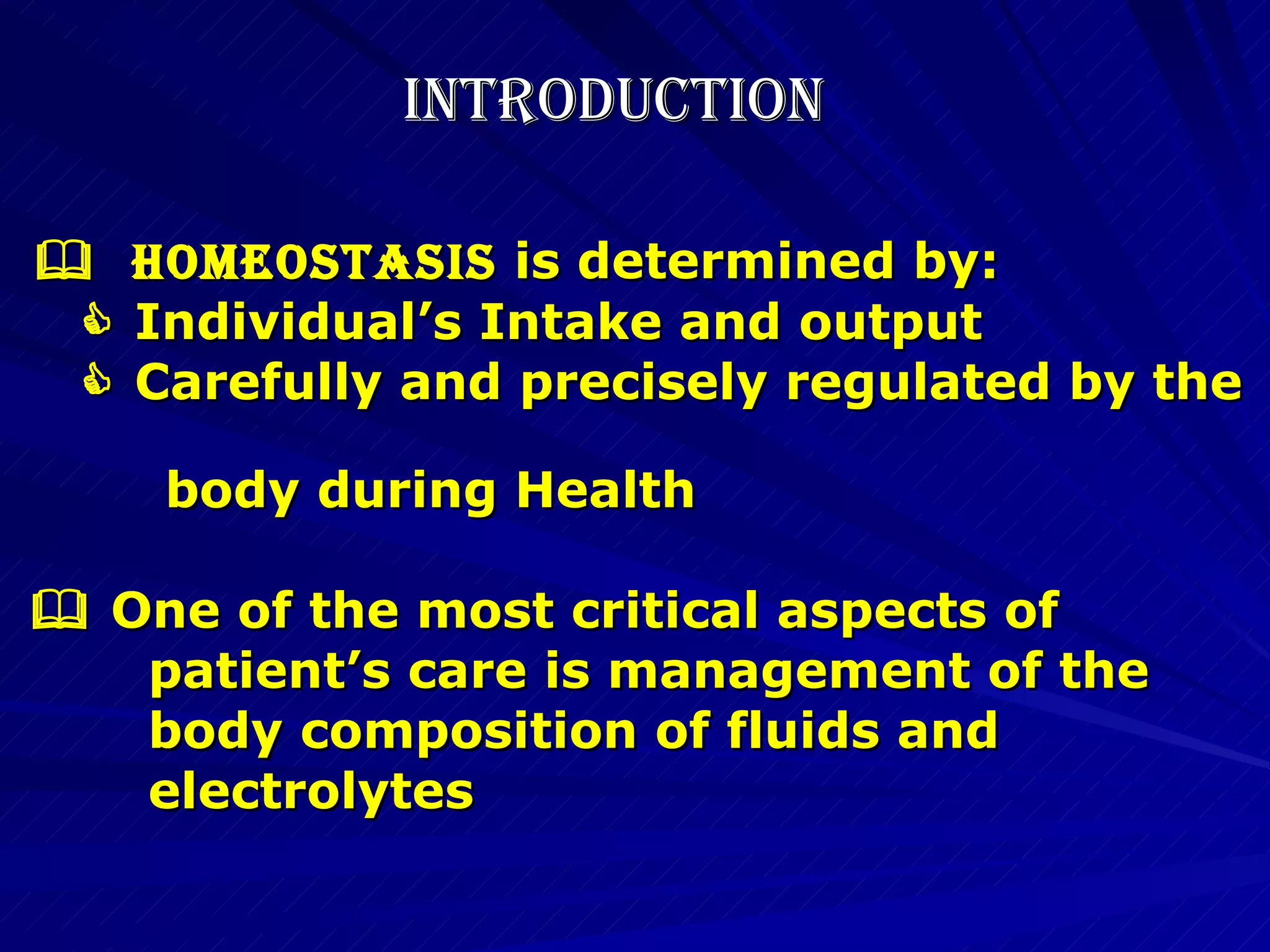 The document discusses homeostasis of fluids and electrolytes in the human body. It covers topics like the different compartments of body water and fluids, electrolyte composition and functions, normal daily fluid and electrolyte losses and requirements, and diagnosis of fluid and electrolyte imbalances. Key points include that total body water is 50-70% of weight, with the highest proportion in infants; the intracellular and extracellular compartments contain different electrolytes like sodium and potassium; and normal losses include 800-1500cc of water and 100-150mEq of chloride daily through urine, skin, lungs and feces.