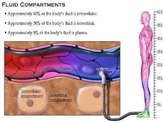 The document provides an extensive overview of body fluids, their sources, functions, composition, and balance, crucial for maintaining homeostasis. It details fluid movements, electrolyte balance, and the effects of various disorders, including hypernatremia and hypokalemia. It also discusses the physiological regulation of water and electrolyte levels, factors affecting fluid balance, and recommendations for managing electrolyte abnormalities.