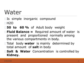 The document discusses fluids and electrolytes in the human body. It covers topics like water distribution and regulation, movement of fluids between compartments, and key electrolytes like sodium, potassium, calcium. Regarding electrolytes, it describes their normal levels and functions and causes and symptoms of abnormalities like hypernatremia, hyponatremia, hyperkalemia, hypokalemia, hypercalcemia and hypocalcemia. The kidneys, hormones like ADH and aldosterone, and osmosis play important roles in fluid and electrolyte balance. Dehydration and overhydration are also covered.