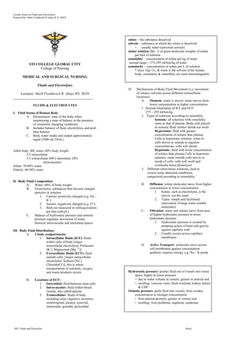 This document provides lecture notes on fluids and electrolytes. It discusses: