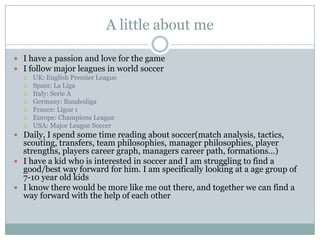This document discusses forming a formalized pickup soccer group for children aged 7-10 to provide a better soccer experience. It notes drawbacks of recreational and competitive leagues and what children this age need - feeling comfortable, confidence, fun, exploration and maximum play. The proposal is to start a group of like-minded parents committed to their children's soccer development. The group would form a club team for the children to play, practice and progress together year-round. Resources like fields, equipment and coaches would be needed. The goal is providing a natural soccer environment focused on player development, teamwork and passion for the game.