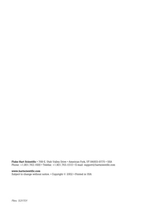 This document is a user's guide for an infrared thermometer calibrator that provides instructions on its safe operation and maintenance. It contains warnings about not touching hot surfaces on the device and maintaining proper spacing. The guide also outlines the device's specifications, operation instructions, and calibration procedures.