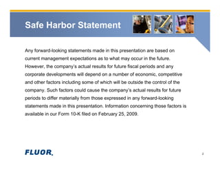 Fluor Corporation reported its financial results for the fourth quarter and full year of 2008. Some key highlights included: 1) Revenue for 2008 increased 34% to $22.3 billion and net earnings increased 35% to $720 million compared to 2007. 2) New awards in 2008 totaled $25.1 billion, an 11% increase over 2007, and backlog grew 10% to $33.2 billion. 3) The company maintained its 2009 EPS guidance range of $3.90 to $4.20 per share, citing substantial backlog, a relatively robust prospect list, and actions to improve overhead leverage.