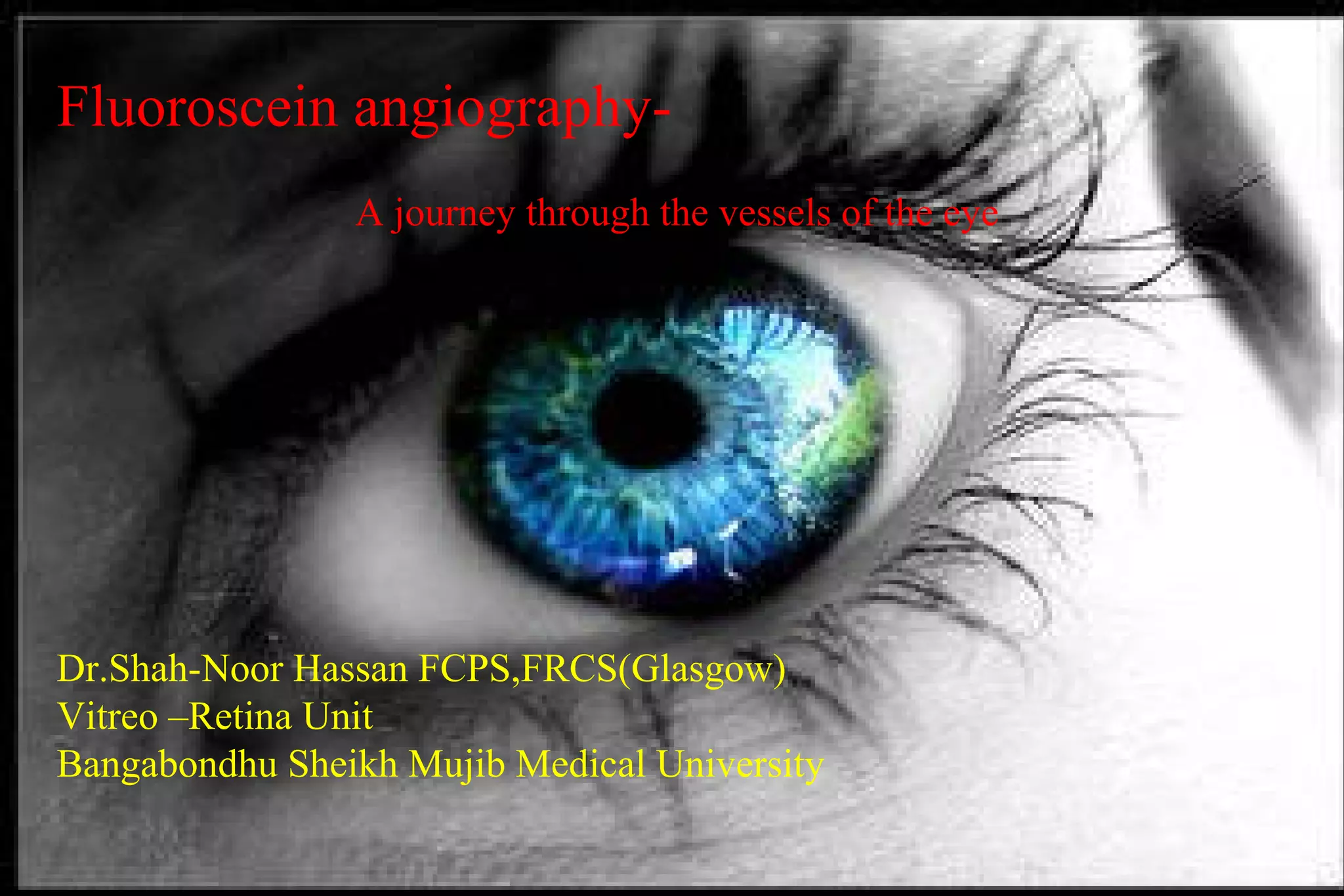 Fluoroscein angiography is a technique used to examine the circulation of the retina and choroid. It involves injecting a fluorescent dye called sodium fluorescein and taking photographs of the eye during different phases as the dye circulates through the vessels. The dye is excited by blue light and emits yellow-green light, allowing visualization of the retinal and choroidal vasculature. Fluorescein angiography provides valuable information used to diagnose and monitor many retinal diseases. Some common uses include detecting leaking blood vessels in wet age-related macular degeneration and evaluating areas of non-perfusion in diabetic retinopathy. While generally safe, rare adverse reactions like allergic reactions may occur.