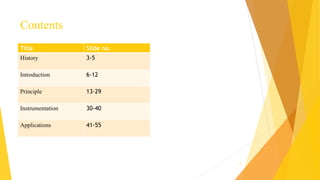 Fluorescence spectroscopy is based on the principle of fluorescence emission that occurs when a molecule absorbs light and is excited to a higher electronic state. The excited molecule then relaxes to the ground state via vibrational relaxation and emission of a photon. The emitted light has a longer wavelength than the absorbed light due to energy losses in vibrational relaxation, following Stokes' rule. Fluorescence spectroscopy can provide information about molecular structure and interactions through analysis of fluorescence emission spectra.