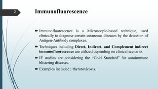 This document discusses immunofluorescence techniques used to diagnose cutaneous diseases. It describes direct, indirect, and complement indirect immunofluorescence. Direct immunofluorescence detects antigens in tissues using fluorescently-labeled antibodies. Indirect immunofluorescence detects patient antibodies using fluorescently-labeled secondary antibodies. Complement indirect immunofluorescence detects antigen-antibody complexes by binding complement proteins. Immunofluorescence is useful for detecting autoantibodies and analyzing antigen and protein distributions in tissues.
