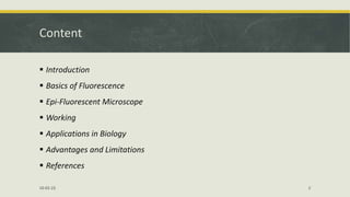 Fluorescence microscopy uses fluorescence to visualize and study samples. It works by exciting fluorophores in the sample with light, causing them to emit light of a longer wavelength. Filters and dichroic mirrors are used to separate the excitation and emission wavelengths. The epi-fluorescence microscope configuration excites and detects fluorescence through the same light path using the objective lens. Applications in biology have expanded from imaging organelles in 1985 to live cell imaging and quantitative analysis today. Advantages include live cell imaging and high specificity, while disadvantages are photobleaching and phototoxicity.