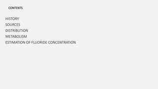 The document provides a comprehensive overview of fluoride, its chemical properties, historical discovery, and its impact on dental health through various phases of research. It details the phases of clinical discovery, epidemiology, demonstration, and technology transfer, highlighting key findings from notable researchers like Dr. Frederick McKay and Dr. Trendley Dean regarding fluoride's role in enamel fluorosis and dental caries prevention. The document also discusses fluoride sources, metabolism, and methods for analyzing fluoride concentration in different environments.