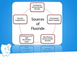Fluoride is a mineral found in nature that helps strengthen tooth enamel and prevents tooth decay. There are two main methods of fluoride delivery: topical and systemic. Topical fluoride is applied directly to the teeth and includes toothpaste, mouthwashes, and professionally-applied gels or varnishes. Systemic fluoride is ingested and provides fluoride through drinking water, supplements, or foods to teeth during development. The benefits of fluoride for dental health are well established, but overexposure can cause dental fluorosis, which results in white spots or pits on teeth. Treatment options for fluorosis depend on its severity and may include bleaching, composite restorations, veneers, or crowns.