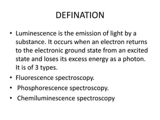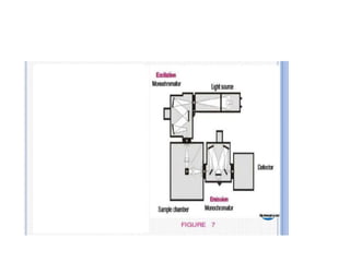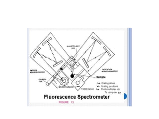 Fluorimetry is a technique that measures fluorescence intensity at a particular wavelength using a fluorimeter or spectrofluorimeter. It works by exciting a molecule's electrons with radiation, causing them to emit radiation upon returning to the ground state. Factors like concentration, quantum yield, incident light intensity, pH, temperature and presence of quenchers can affect fluorescence. Fluorimetry has advantages like high sensitivity, precision and specificity and is useful for determining various inorganic/organic substances and compounds.