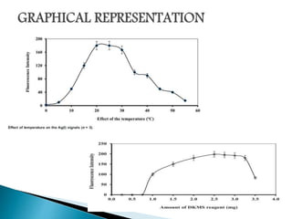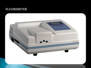 This document discusses the principles and applications of fluorimetry. It defines fluorescence as the emission of light from excited electrons returning to ground state. Fluorimetry involves using ultraviolet light to excite sample molecules, which then emit light of lower energy. Factors that influence fluorescence intensity are discussed. Common instrumentation includes light sources, monochromators, cuvettes, detectors, and data analyzers. Applications include determining inorganic substances, proteins, and steroids. Two case studies on analyzing glucose in milk and silver in food/water samples using fluorimetry are presented.