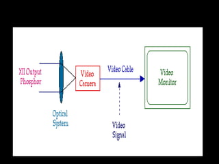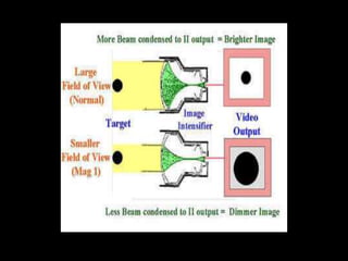 The document discusses the history and components of fluoroscopy systems. Early fluoroscopy required complete darkness as it relied on rod vision, exposing patients and radiologists to high radiation. Modern systems use an image intensifier to amplify images 500-8000x, allowing viewing on a TV screen using cone vision with less radiation exposure. The image intensifier converts x-rays to light through an input phosphor, then light to electrons via a photocathode. Electrostatic lenses accelerate electrons onto an output phosphor, reconverting them to brighter light for display. Cesium iodide replaced earlier phosphors for better x-ray absorption and resolution.