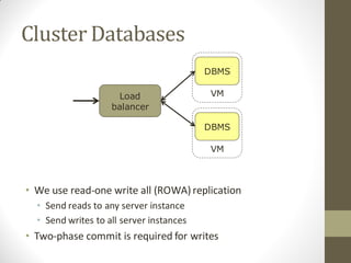 FlurryDB is a dynamically scalable relational database that uses virtual machine cloning to elastically scale database instances. It uses a two-phase commit protocol to maintain consistency when cloning database instances. The cloning process allows new database instances to be added in seconds, rather than hours, by copying the database state through virtual machine forking. FlurryDB addresses challenges in incorporating new workers into the cluster and preserving application semantics during cloning through the use of a cloning-aware proxy. It was shown to effectively scale a sample news website application under increasing load by cloning database instances.