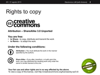 Il documento descrive un laboratorio di elettronica con Arduino, tenutosi dal 28 al 31 agosto 2013, incentrato su interazioni umane e ambientali tramite l'uso di vari sensori e programmazione. L'approccio include la programmazione di cicli, comunicazioni seriali e l'uso di librerie come capsense per rilevare cambiamenti capacitivo. L'obiettivo è creare interazioni dinamiche attraverso dispositivi come sensori di temperatura e sonori per generare effetti visivi e audio.
