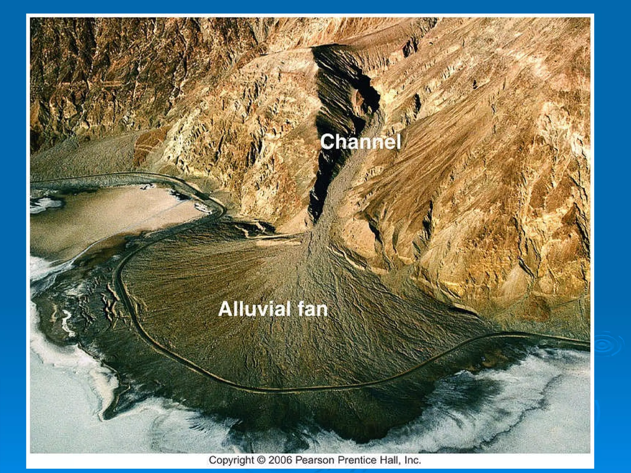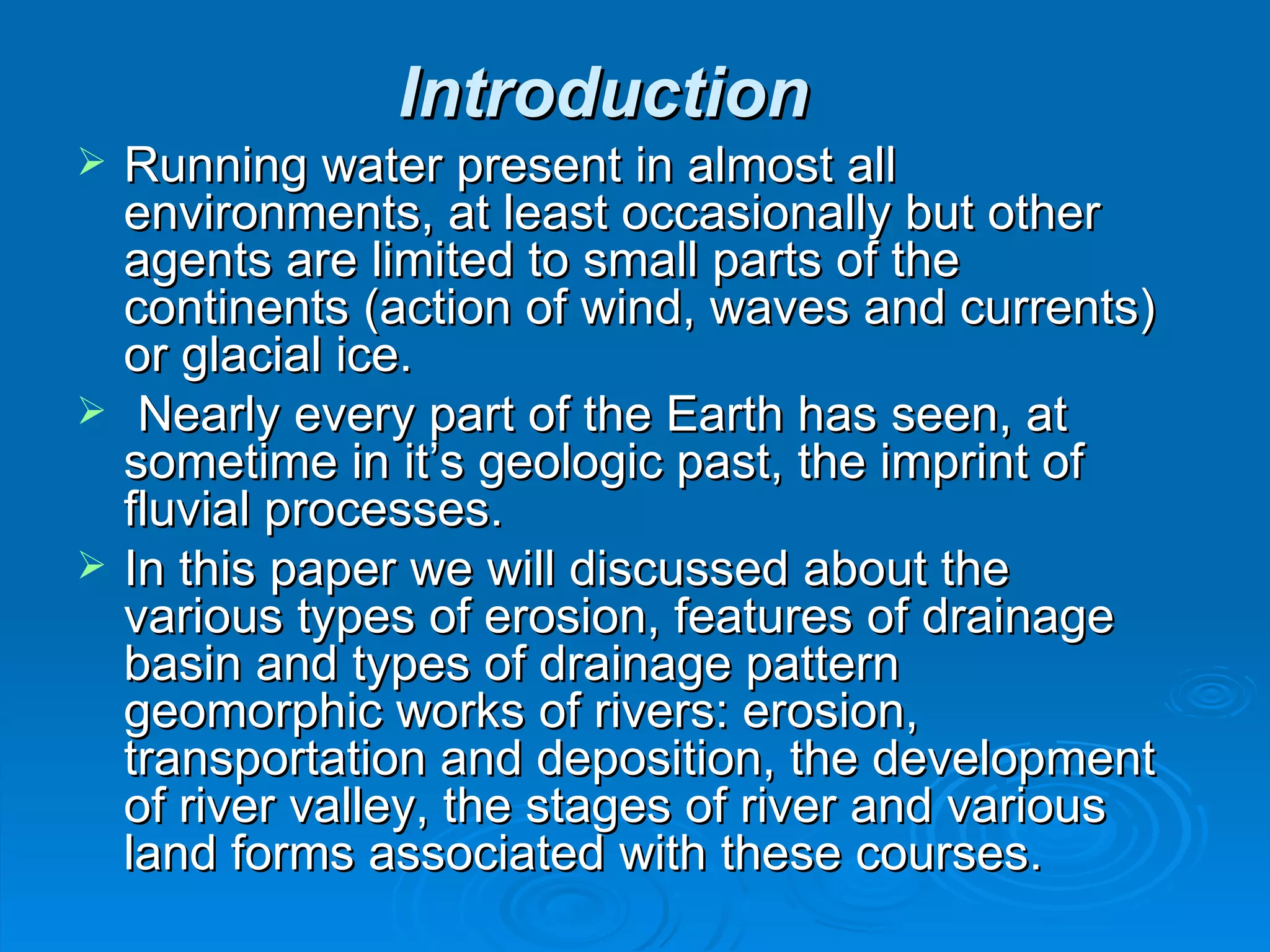 The document discusses fluvial processes and landforms. It describes various types of erosion caused by water including surface erosion through splash and sheet erosion, and channel erosion through rills, gullies, and streams. It also discusses drainage basins and patterns, explaining how drainage patterns are influenced by geology and reflect the arrangement of river courses. Various landforms resulting from fluvial processes are also mentioned.