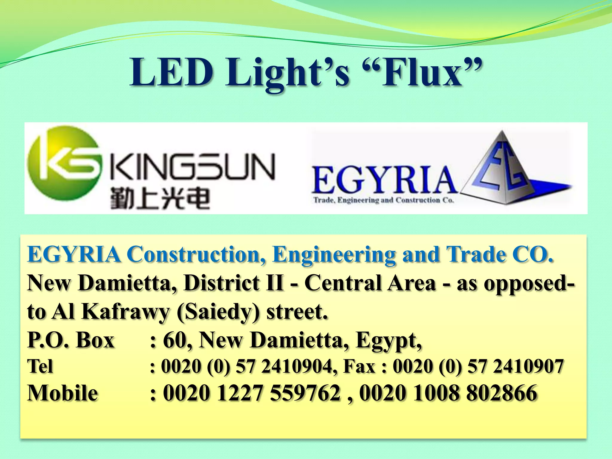 This document provides specifications for multiple LED street light models produced by Kingsun. It describes that each model uses a special quadric optical lens that casts light from the LED source onto a rectangular area to minimize light waste and pollution. The light distribution system can be designed through software to meet various lighting demands. Tables are included listing the wattage, voltage, mounting height, dimensions, coverage area, and light flux measurements for each model.