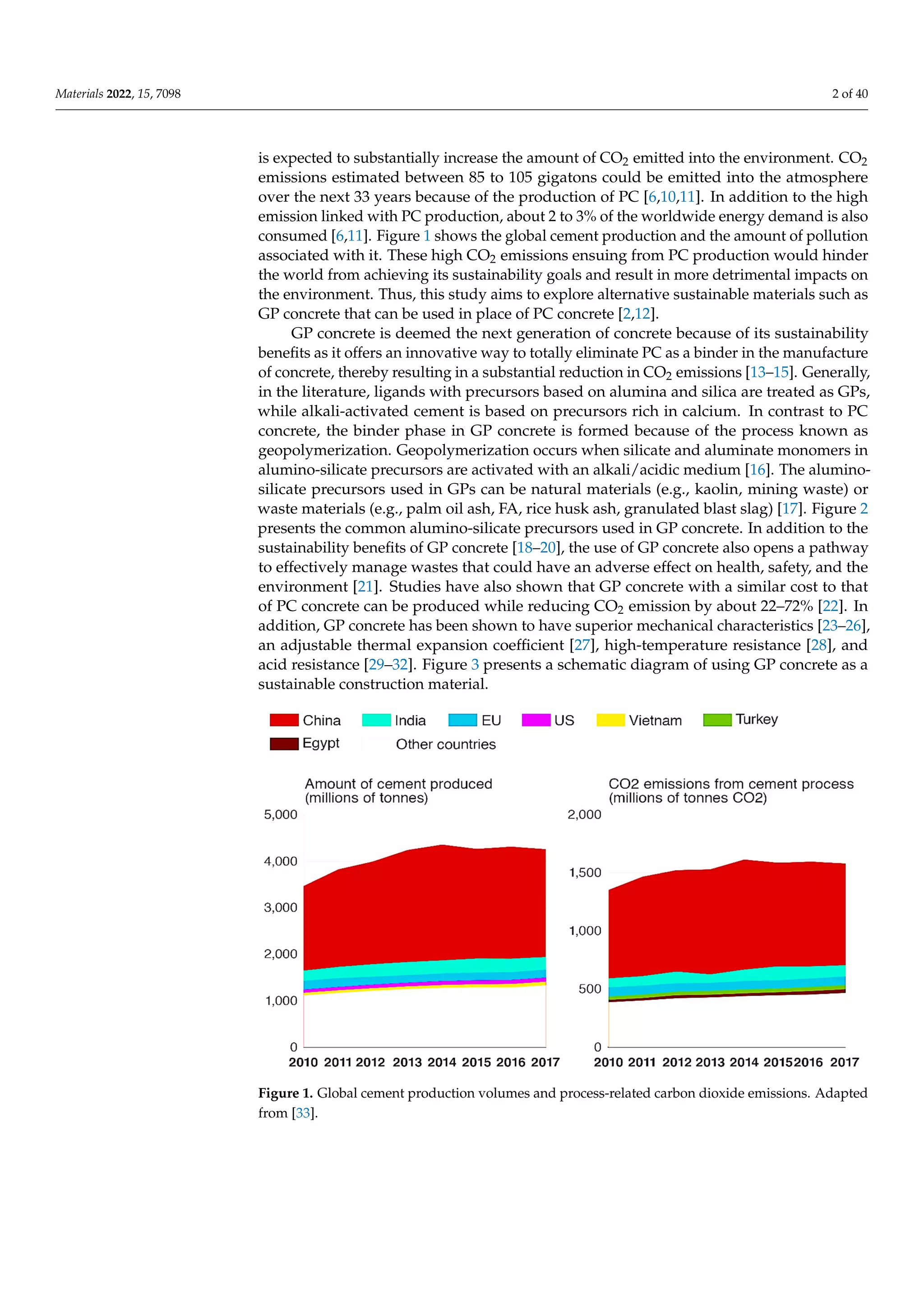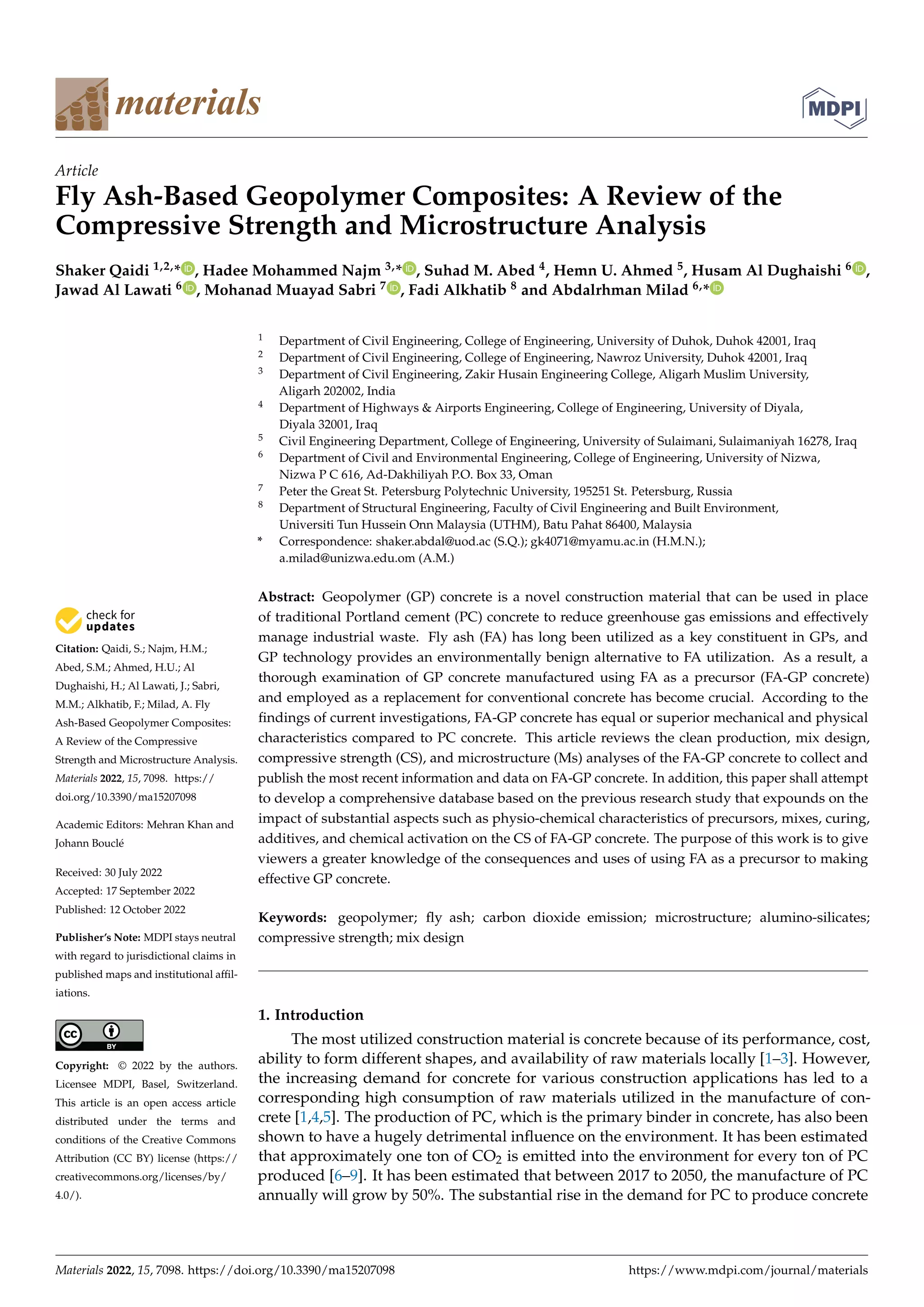 The document reviews fly ash-based geopolymer composites, highlighting their compressive strength and microstructure analysis as a sustainable alternative to traditional Portland cement concrete. It emphasizes the environmental benefits of geopolymer (gp) concrete in reducing greenhouse gas emissions and effectively managing industrial waste. The study consolidates recent research on the mechanical and physical properties of fly ash geopolymer concrete, focusing on mix design and the implications of various factors on its compressive strength.