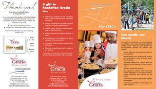 Fondation Gracia thanks donors and recognizes their contributions in various ways depending on the donation amount, including having their name placed on an honour board or a plaque. The foundation uses donations to support programs that help children, youth, families, seniors and those with disabilities by providing healthcare, education, and community services. Donations go towards ensuring the well-being of all.