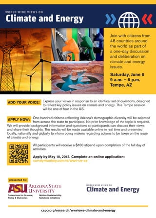 This document announces a one-day discussion in Tempe, Arizona on June 6th where 100 citizens from across the state will discuss and deliberate on key climate and energy policy issues as part of a global event. Participants will respond to an identical set of questions, receive background information, and discuss their views which will be presented to policymakers to inform actions on climate and energy. Citizens can apply by May 10th and will receive $100 for completing the full day of activities.