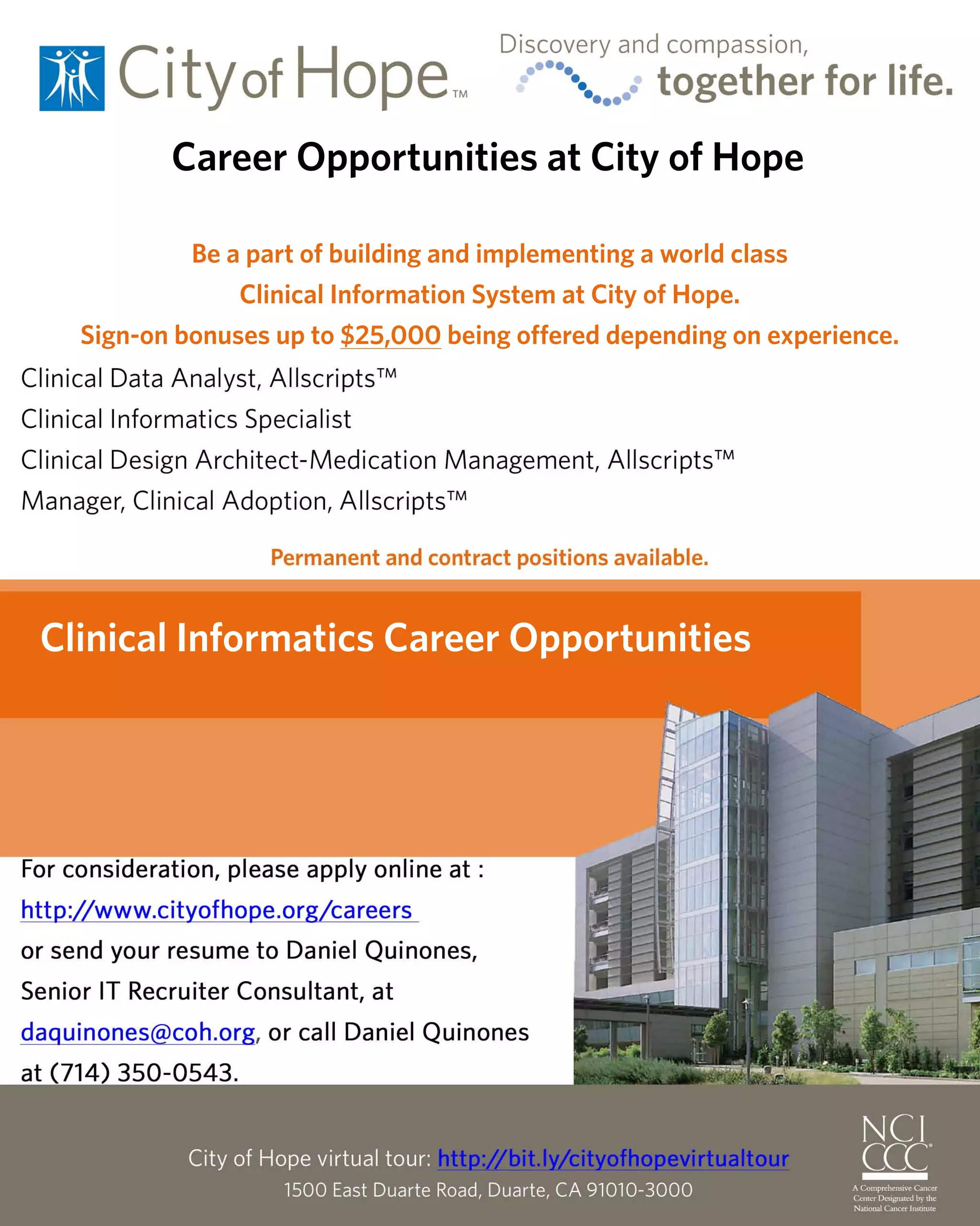 City of Hope is seeking Senior Clinical Informatics CIS professionals