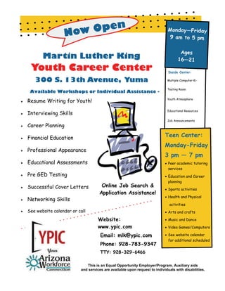 The Martin Luther King Youth Career Center provides workshops and individual assistance in resume writing, interview skills, career planning, financial education, and other areas to help youth ages 16-21 with their job searches and education. The center has multiple computers, a testing room, and educational resources. It also operates a teen center with tutoring, activities, and a space for youth to spend afternoons and evenings.