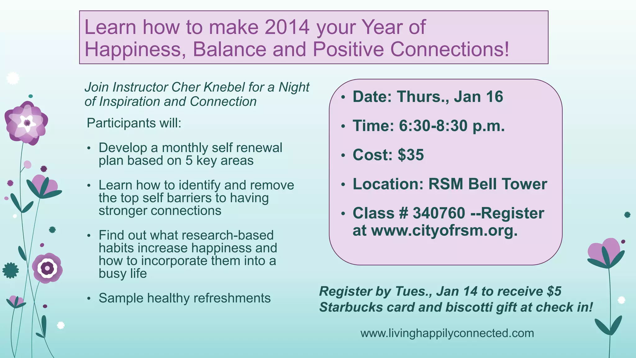 Join instructor Cher Knebel on January 16 from 6:30-8:30 pm at the RSM Bell Tower for a night of inspiration and connection focused on developing a self renewal plan, learning how to strengthen connections by removing barriers, and incorporating research-backed habits to increase happiness into a busy life, all for $35.