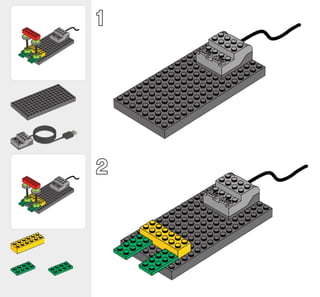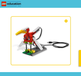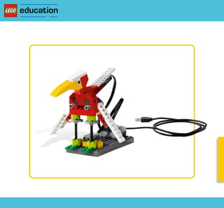 The document provides instructions for building a LEGO robot using the WEDO construction set. The robot can be programmed to perform simple tasks like moving forward or making sounds. Students are guided through building the different components like the body, wheels, and sensors. They are then shown how to connect the components and use the software to program the robot's behaviors.