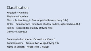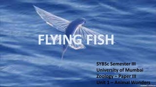 The document provides an overview of flying fish, specifically the tropical two-winged flying fish (Exocoetus volitans), detailing its classification, habitat, external appearance, flight mechanism, prey and predators, migration patterns, and economic importance. It highlights its unique ability to glide above water for significant distances and outlines its role in commercial fishing and cultural significance in regions like Barbados and Taiwan. The lifespan of these fish is approximately five years, and they have a notable adaptation allowing them to evade predators and migrate effectively.