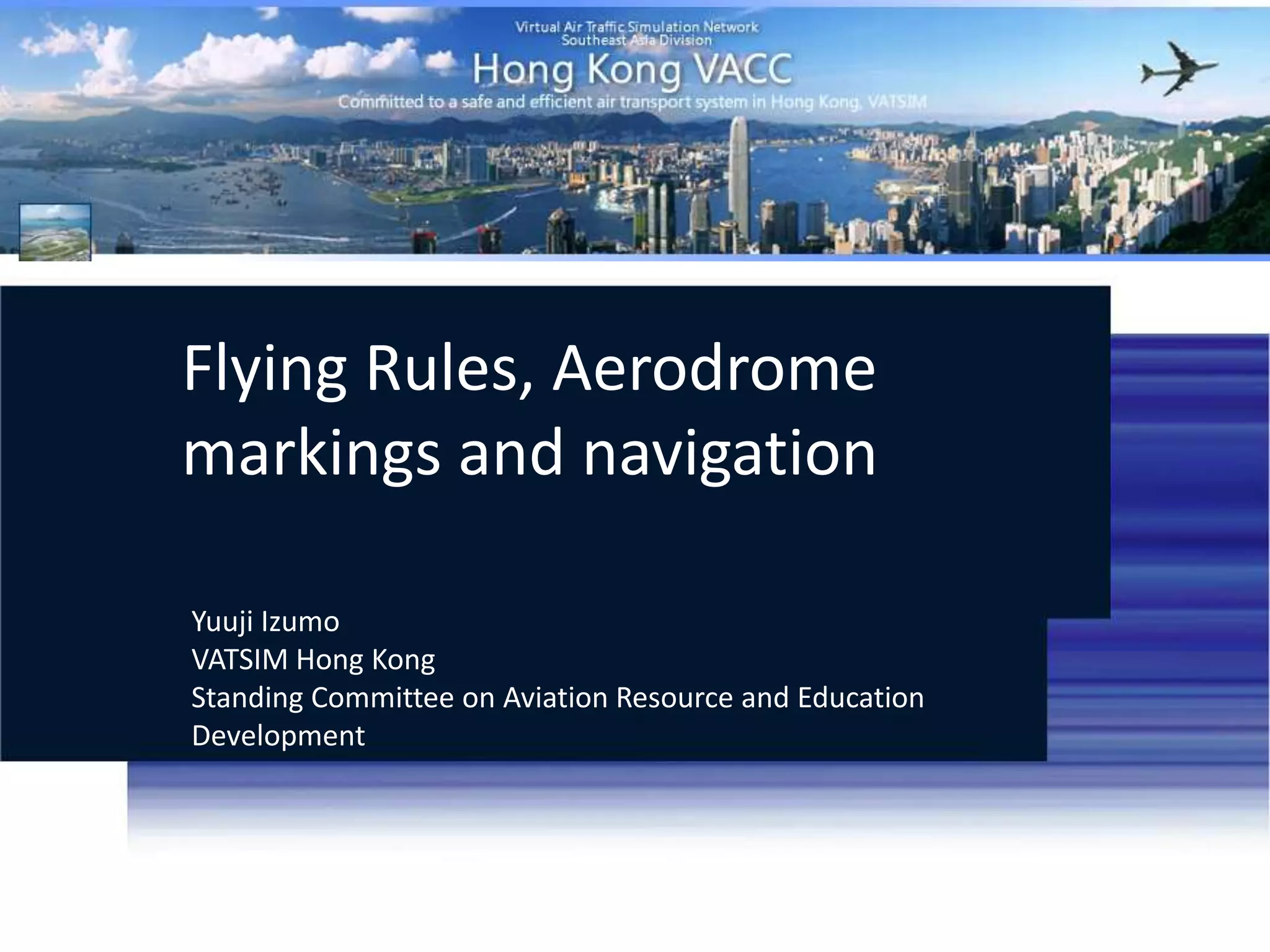 This document discusses different topics related to flying rules, aerodrome markings and navigation including: flying rules for IFR and VFR, aerodrome markings like runway and taxiway markings, aerodrome signs, and different types of radio navigation aids like VOR, NDB, ILS, DME, RNAV, and RNP. The objectives are for trainees to understand different flying rules, aerodrome signs and layouts, and how to identify different navigation aids.
