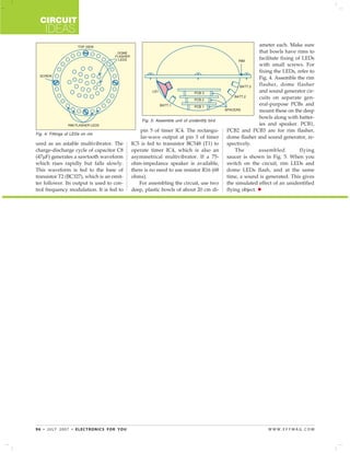 This document describes the circuit design for an electronic toy modeled after a flying saucer. It has three sections: a rim flasher circuit using LEDs around the edge that flash sequentially, a dome flasher circuit with LED groups that flash at different rates, and a sound generator circuit. The circuits are built on separate PCBs and mounted in plastic bowls covered with a transparent dome to create the visual effect of a flying saucer when powered on.