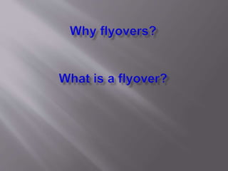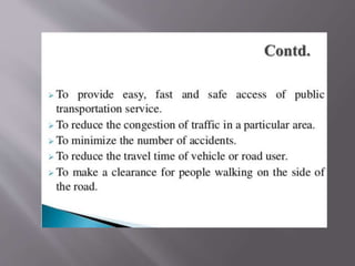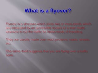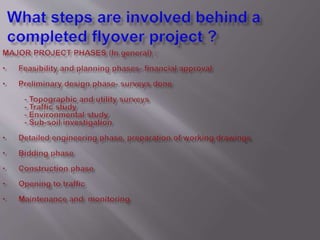 The document discusses a proposed flyover project at Nagerbazar Junction in Kolkata, India. Nagerbazar Junction is an important intersection of Dum Dum Road and Jessore Road that experiences daily congestion due to markets, buildings, and an accumulation of buses and autos. To ease traffic flow, the Transport Department of West Bengal has proposed constructing a flyover along Jessore Road with an entry ramp from Dum Dum Road.