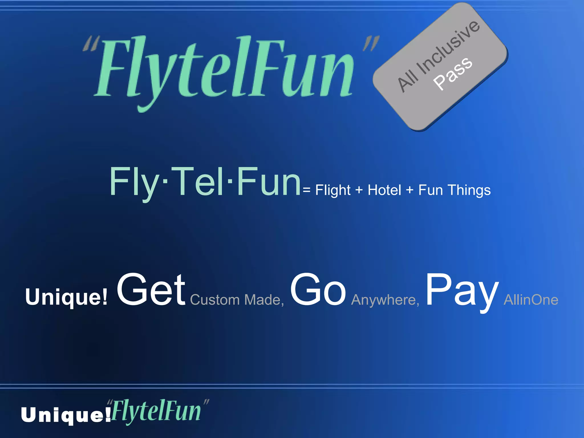 Fly∙Tel∙Fun provides a customizable all-inclusive travel pass for flights, hotels, and activities for families and groups. The pass can be tailored to cover an entire family or group's travel needs. Customers work with a travel consultant to create a unique itinerary and pay one price for the all-inclusive trip.