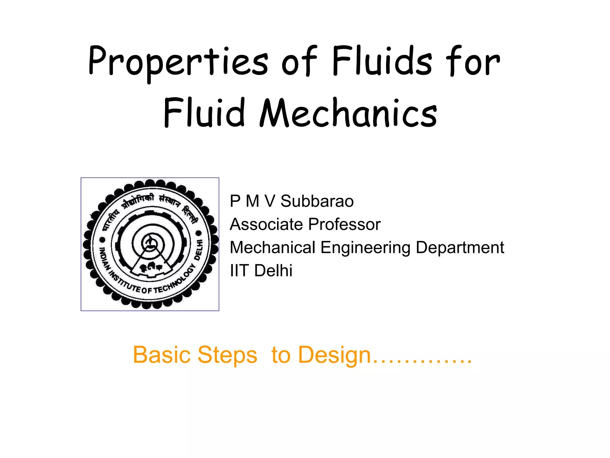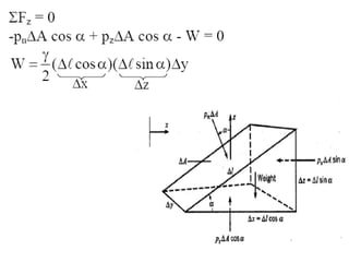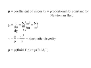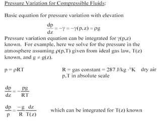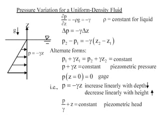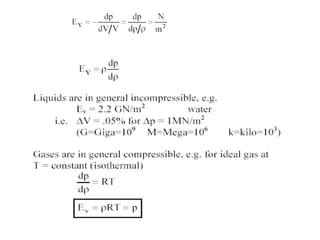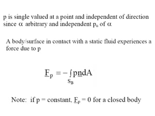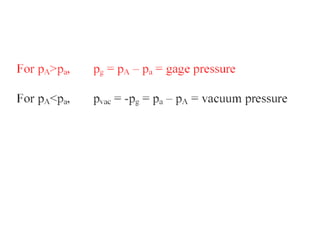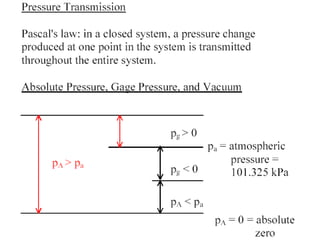 This document discusses several key properties of fluids relevant to fluid mechanics. It defines continuum hypothesis, static fluids, stress tensors, pressure variation with elevation, and measurement of pressure. Pressure can be absolute, gauge, or vacuum. Other fluid properties mentioned include shear stress, elasticity, surface tension, and vapor pressure.
