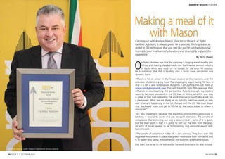 Andrew Mason discusses the facilities management (FM) industry in South Africa. He notes that compliance regulations are becoming more onerous, especially in the banking sector, and this will separate successful from unsuccessful companies. However, outsourcing is on the rise as companies seek specialist knowledge from external providers. Mason also expresses disappointment that the industry has not taken up a new tool for assessing the energy footprint of existing buildings. Overall, he believes FM is heading into a more disciplined and dynamic space.