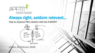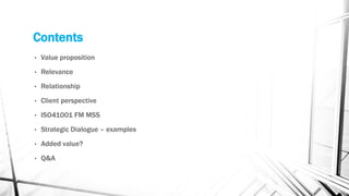 The document discusses improving facility management (FM) relationships with the C-suite by creating relevance and delivering value. It highlights the importance of understanding client needs and engaging in strategic dialogue, supported by ISO 41001, which has shown to enhance performance and cost savings in organizations. The overarching goal of FM is to integrate people, place, and process to improve quality of life and business productivity.