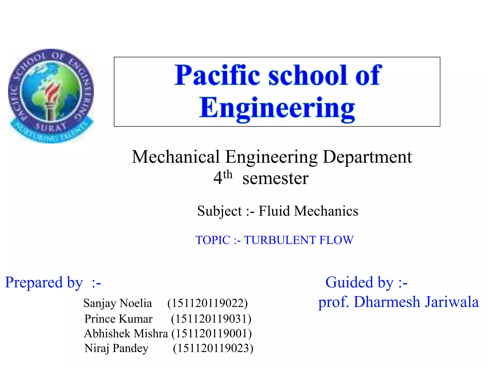 The document discusses fluid mechanics, specifically focusing on turbulent flow and its characteristics, including its transition from laminar flow based on Reynolds number. It explains how factors like velocity and pipe diameter affect flow type and describes the experimental findings of Reynolds regarding pressure loss and friction in turbulent flow. Additionally, it elaborates on shear stress in turbulent flow, including Prandtl's mixing length theory for calculating turbulent shear stress.