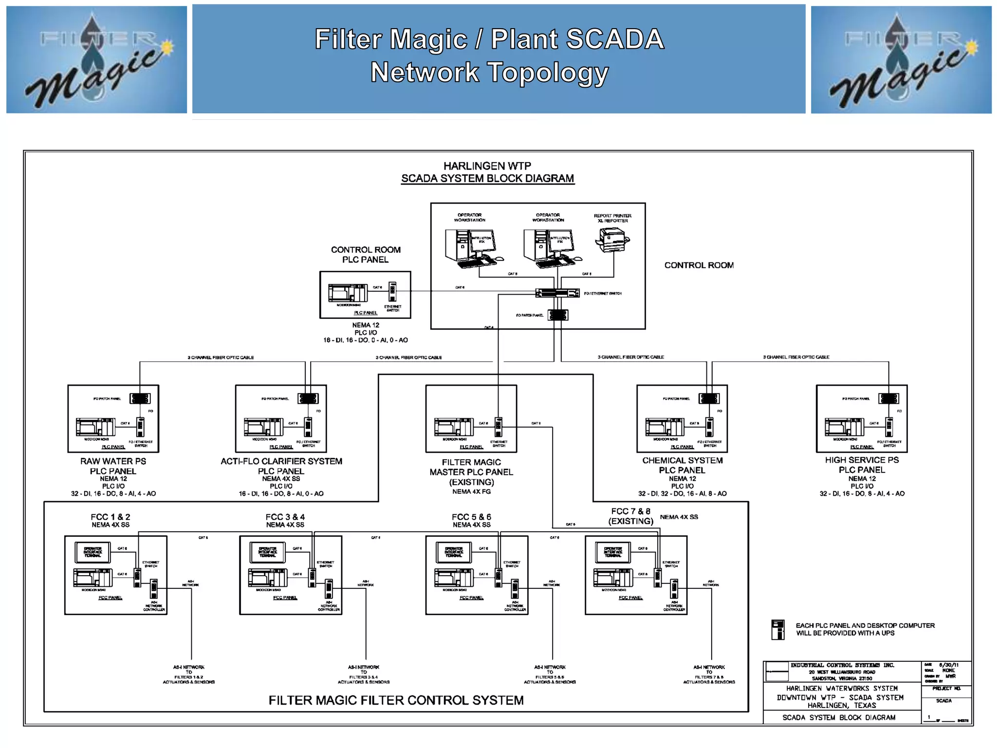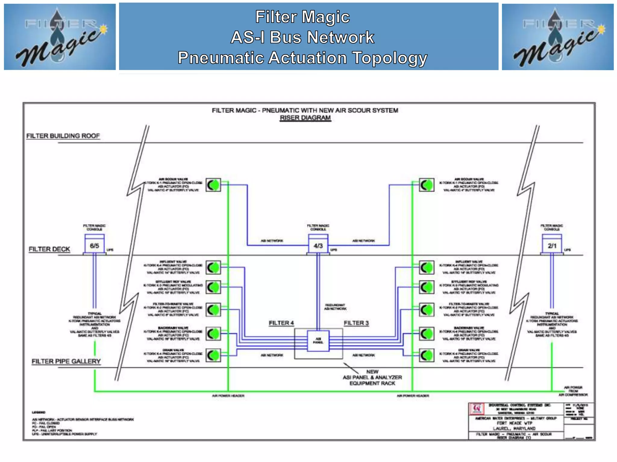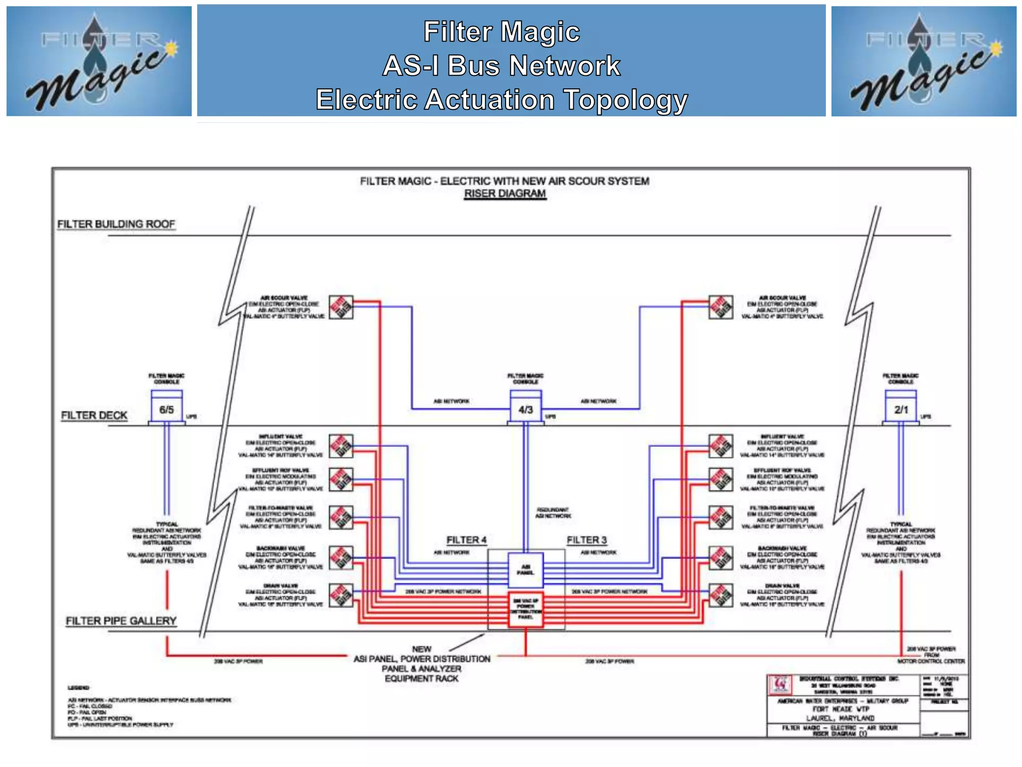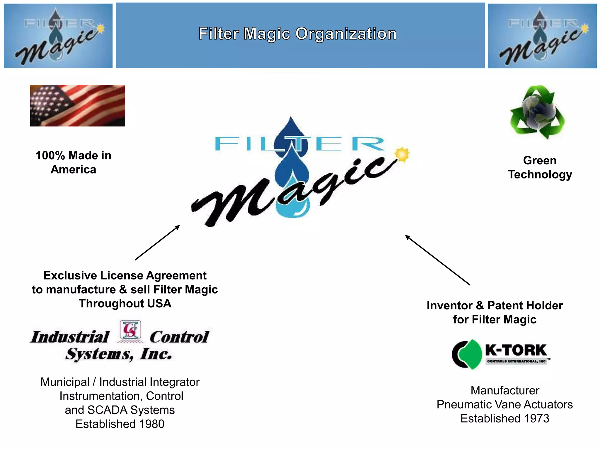 This document presents Filter Magic's green technology for industrial control systems. It offers an exclusive license agreement to manufacture and sell Filter Magic systems throughout the USA. Filter Magic solutions can reduce installation costs by up to 60% and include NEMA rated filter consoles, touch screen interfaces, and AS-I bus networks to connect valves, actuators, and instrumentation. The AS-I network uses two-wire cable for power and communications, is robust and reliable, and eliminates power in filter galleries.