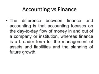 Finance is concerned with the management of assets and liabilities and planning for future growth, while accounting focuses on day-to-day financial transactions. The key functions of financial management include investment decisions about allocating funds, financing decisions around obtaining funds, and dividend decisions about distributing profits. The objectives of financial management are to maintain liquidity and profitability, maximize shareholder wealth over the long run, and ensure the efficient utilization of financial resources.