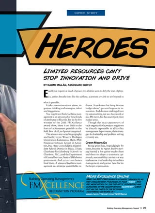 The document discusses five winners of the 2011 FMXcellence award for excellence in facilities management: Western Michigan University, PNC Financial Services Group, Hays Consolidated Independent School District, Charlotte-Mecklenburg Schools, and the Department of Central Services for the State of Oklahoma government. It provides examples of how each organization demonstrated leadership and innovation in facilities management, with an emphasis on sustainability initiatives. The State of Oklahoma implemented a comprehensive sustainability plan that has reduced energy usage by 18% across state buildings. Western Michigan University made sustainability a campus-wide priority, becoming the first university to achieve LEED-EBOM Gold certification for an existing building. Reorganizing operations teams and centralizing expertise helped the State of Oklahoma and