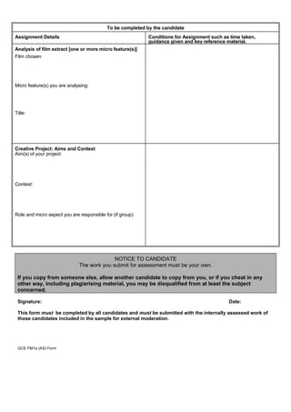 This document contains forms for assessing a student's film studies assignments. It includes sections for teachers to provide comments and marks for the student's analysis of a film extract, creative project, and reflective analysis. The student must provide details of the assignments such as the film and microfeatures analyzed, aims and context of their creative project, and their individual role if working in a group. The forms require signatures from both the teacher and student to confirm the work is the student's own and was properly supervised.
