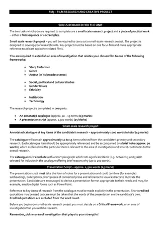 The document provides guidance for students completing a small-scale research project and presentation as part of an FM3 film studies course. It outlines the key requirements, including: [1] Completing a research project focused on one film and referencing at least two other related films; [2] Creating an annotated catalogue of 10-15 research sources; [3] Writing a 1,500 word presentation script in a format suited for presenting, rather than an essay. The document provides advice on choosing an appropriate focus film and area of investigation, conducting research, compiling the catalogue, and constructing the presentation script.