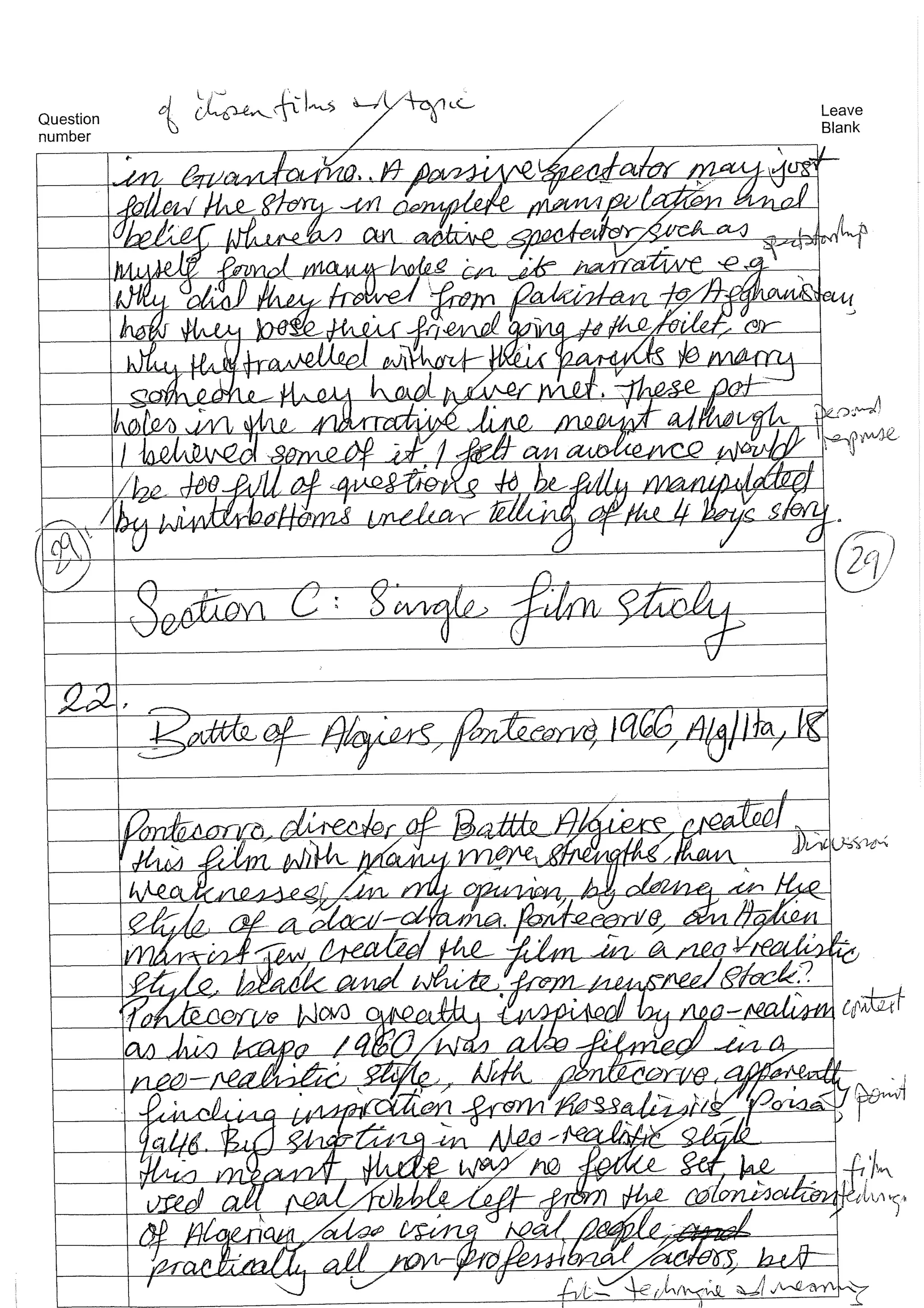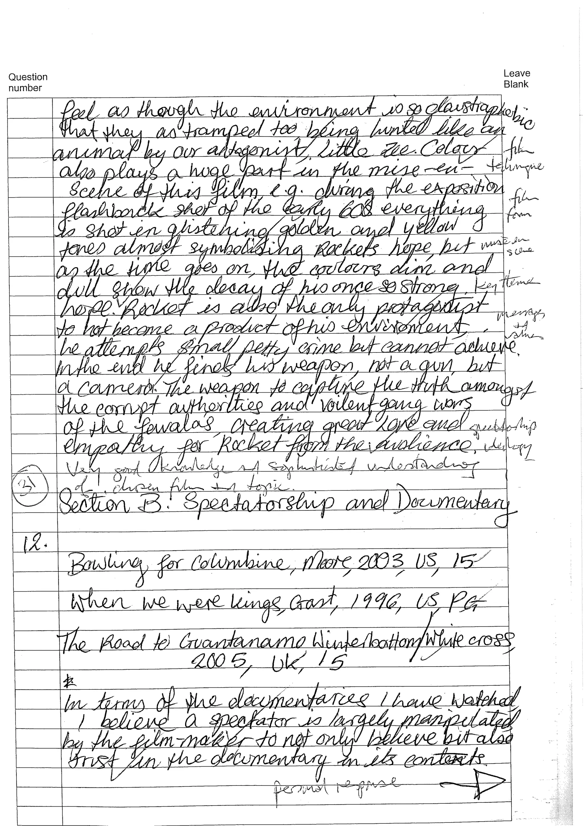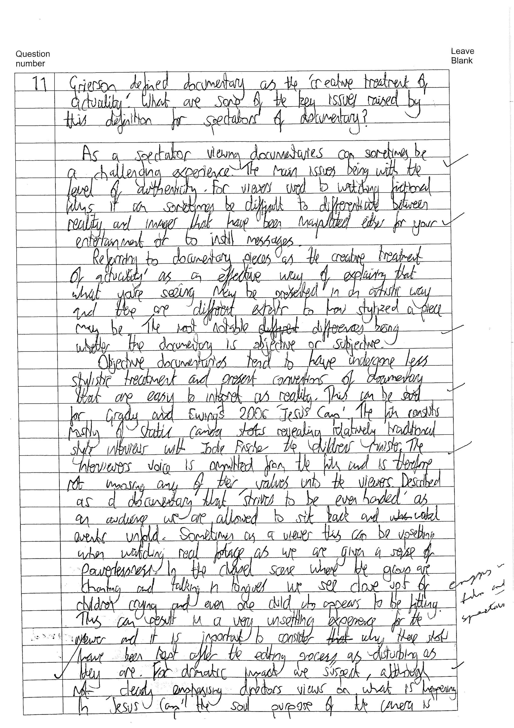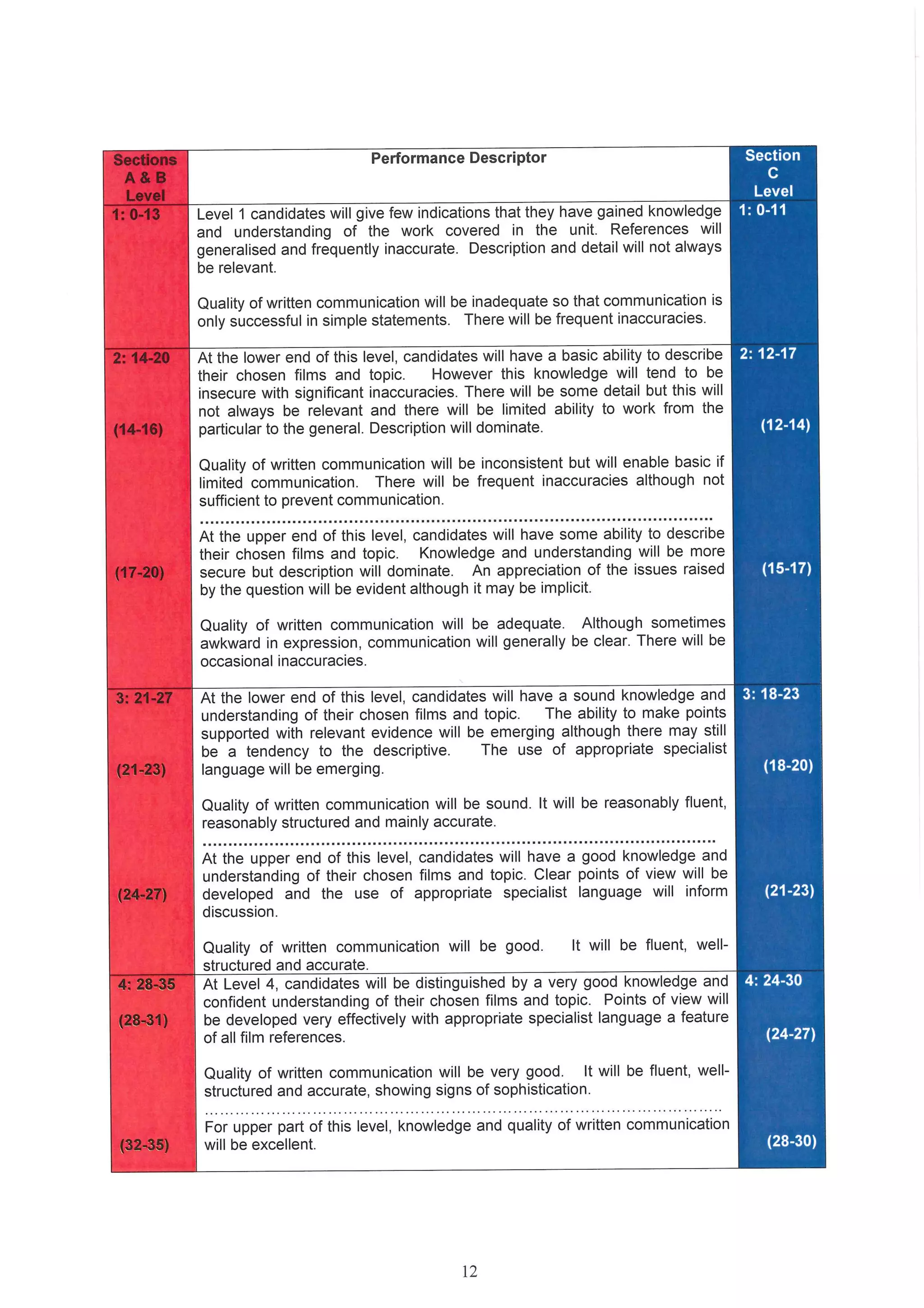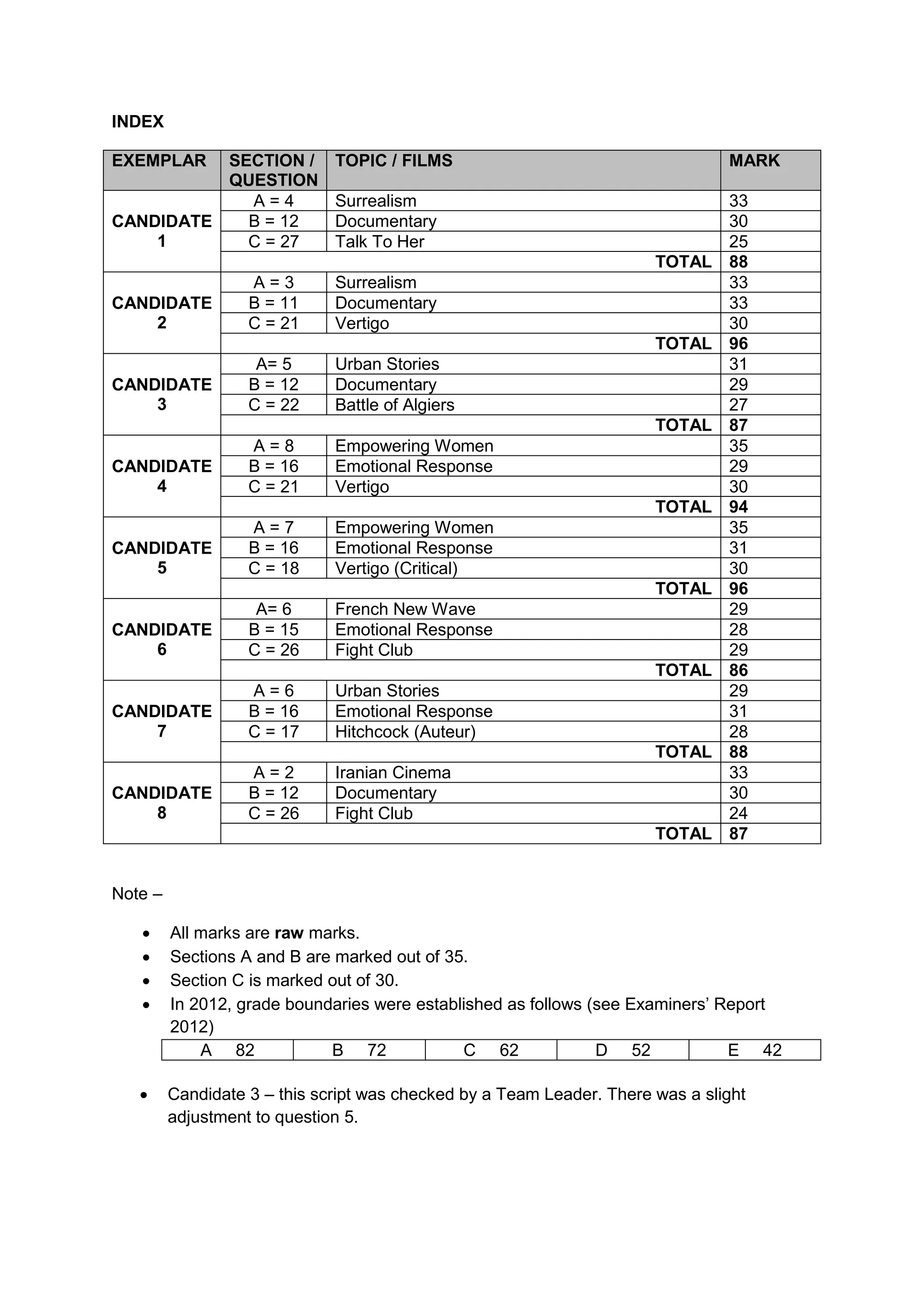 This document contains exemplar scripts from 8 candidates who took the GCE Film Studies exam. It provides a brief overview of each candidate's responses including the topics/films discussed in each section and their raw marks. The topics covered a wide range of film genres, movements and issues. Overall marks ranged from 86 to 96 and section marks were out of 35 for sections A and B, and 30 for section C. Grade boundaries for the exam are also provided.