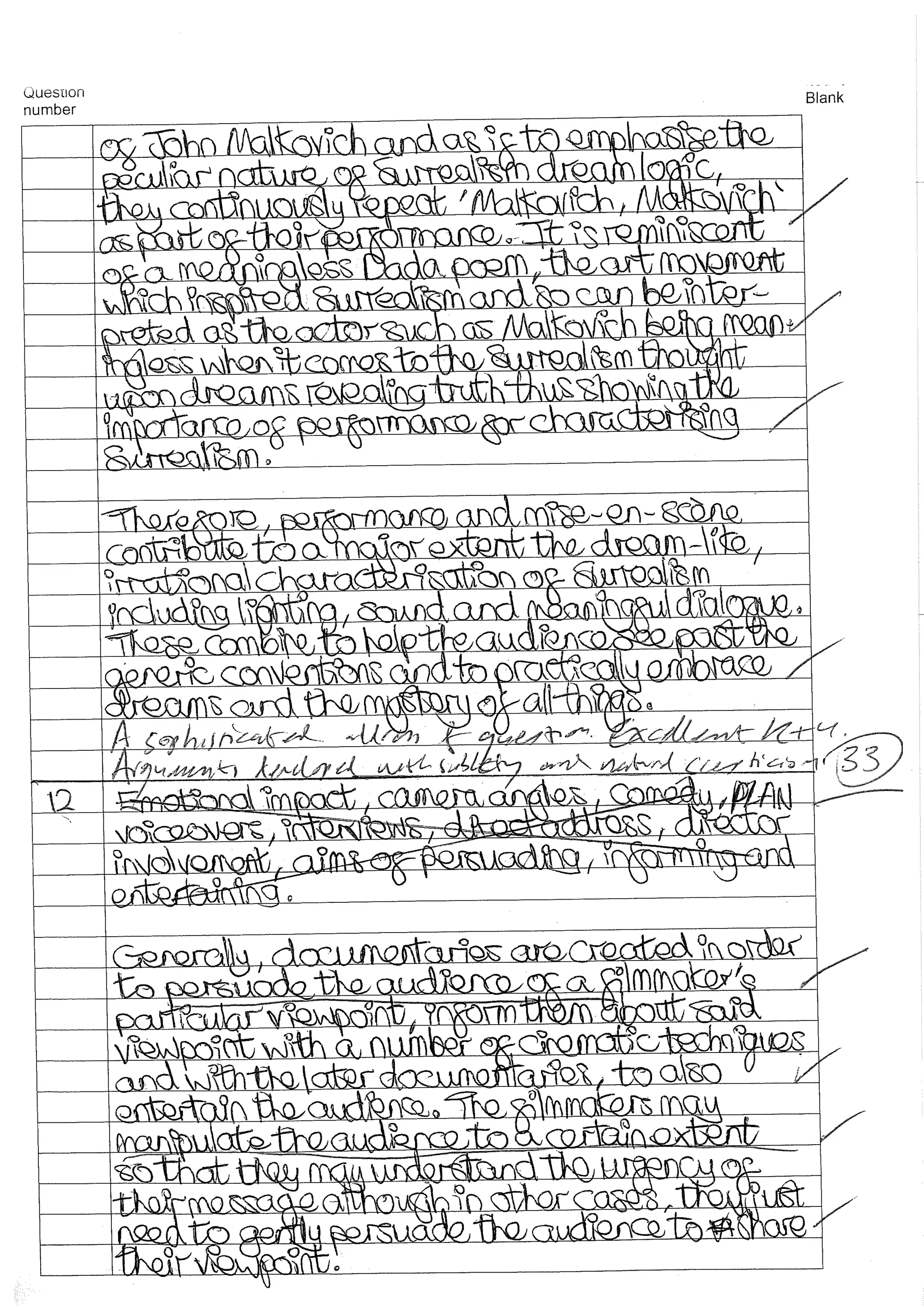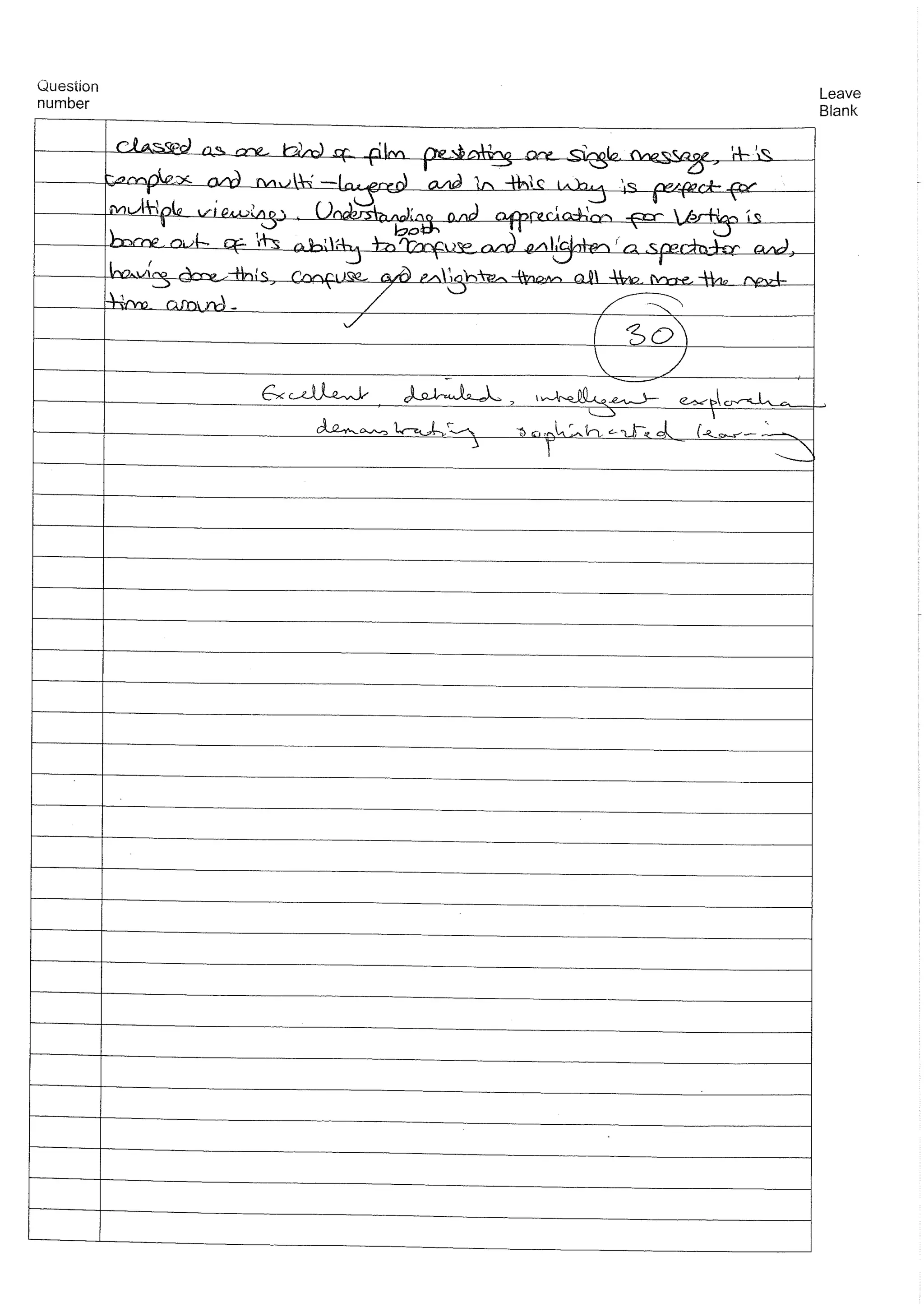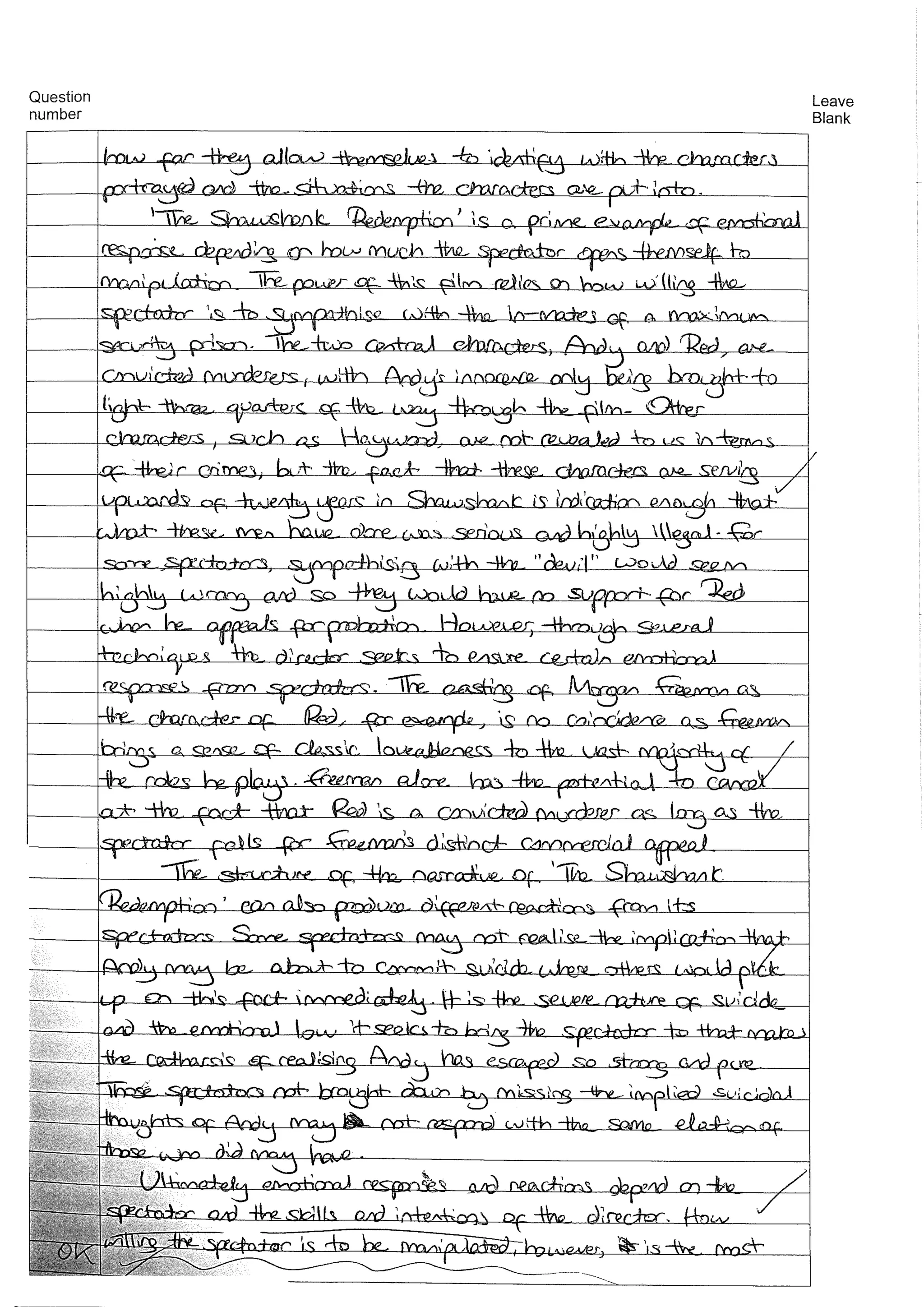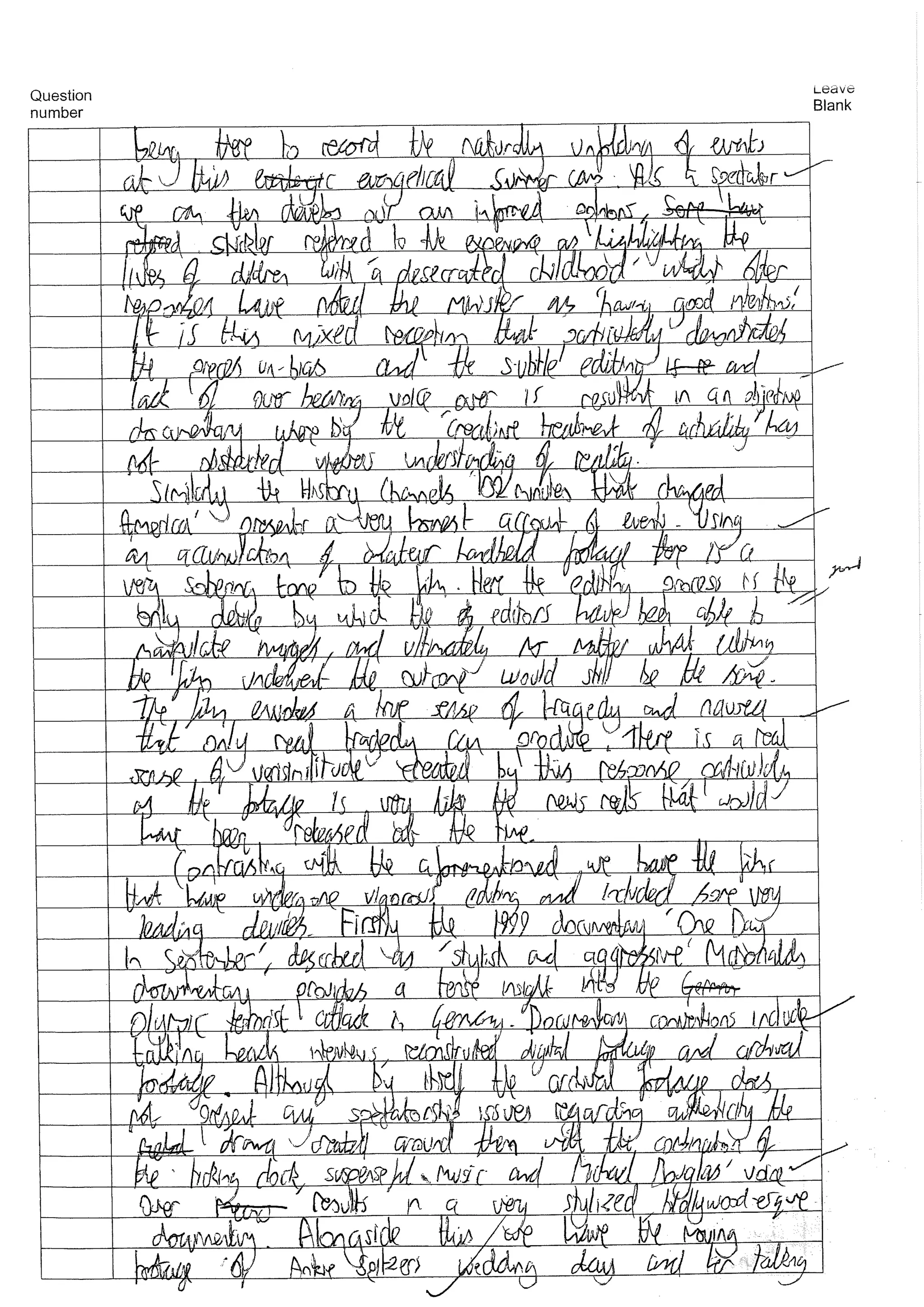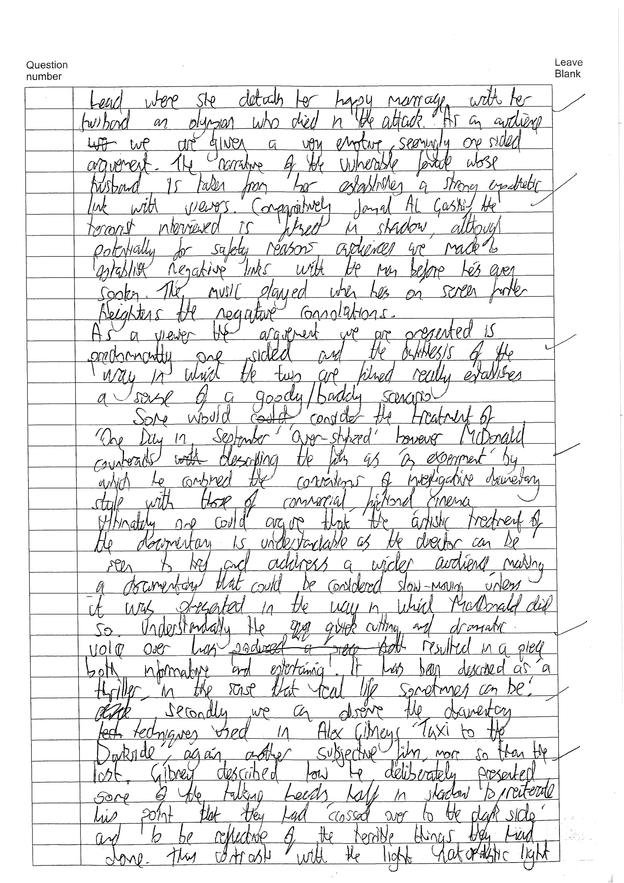 This document contains exemplar scripts from 8 candidates who took the GCE Film Studies exam. It provides a brief overview of each candidate's responses including the topics/films discussed in each section and their raw marks. The topics covered a wide range of film genres, movements and issues. Overall marks ranged from 86 to 96 and section marks were out of 35 for sections A and B, and 30 for section C. Grade boundaries for the exam are also provided.
