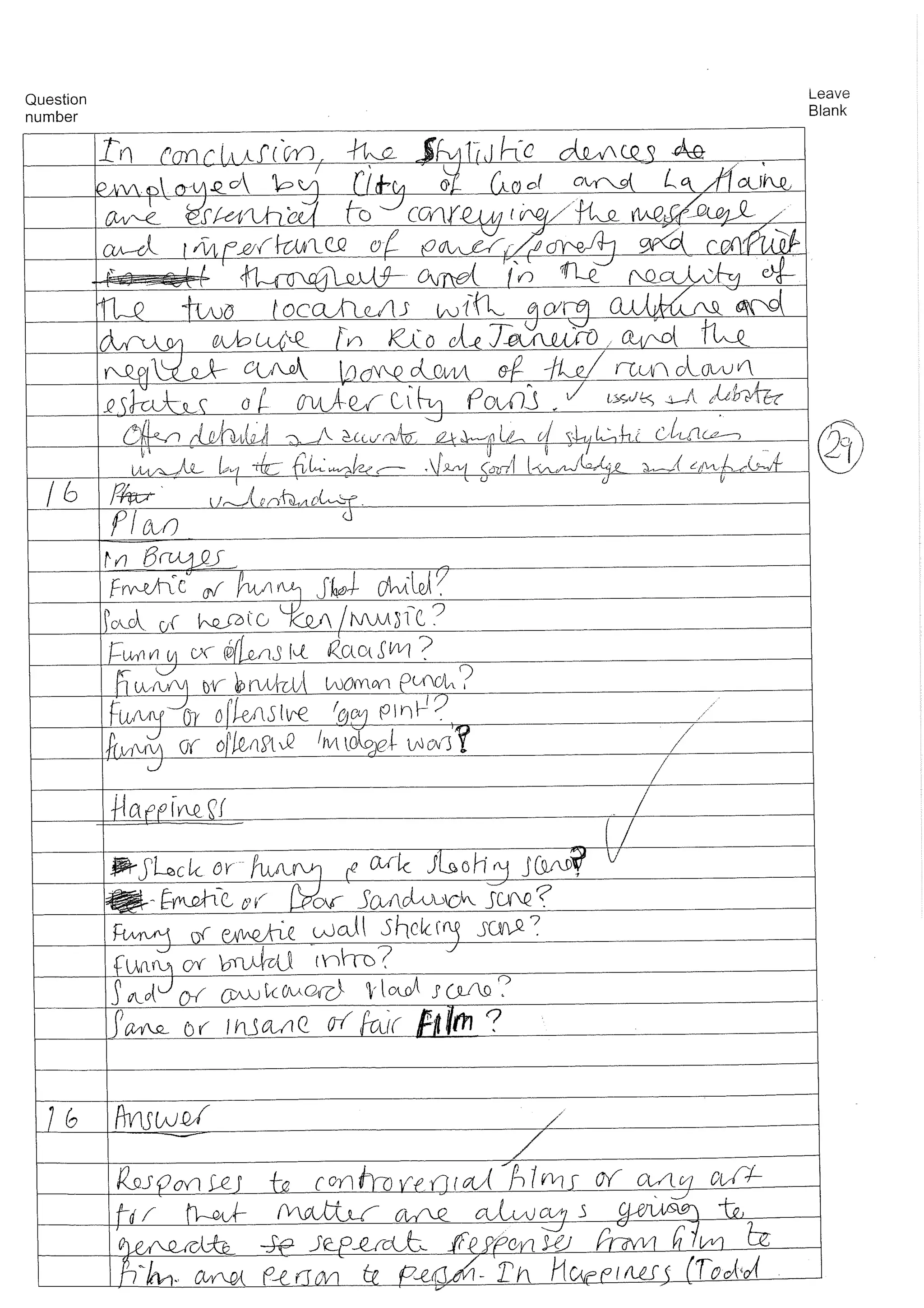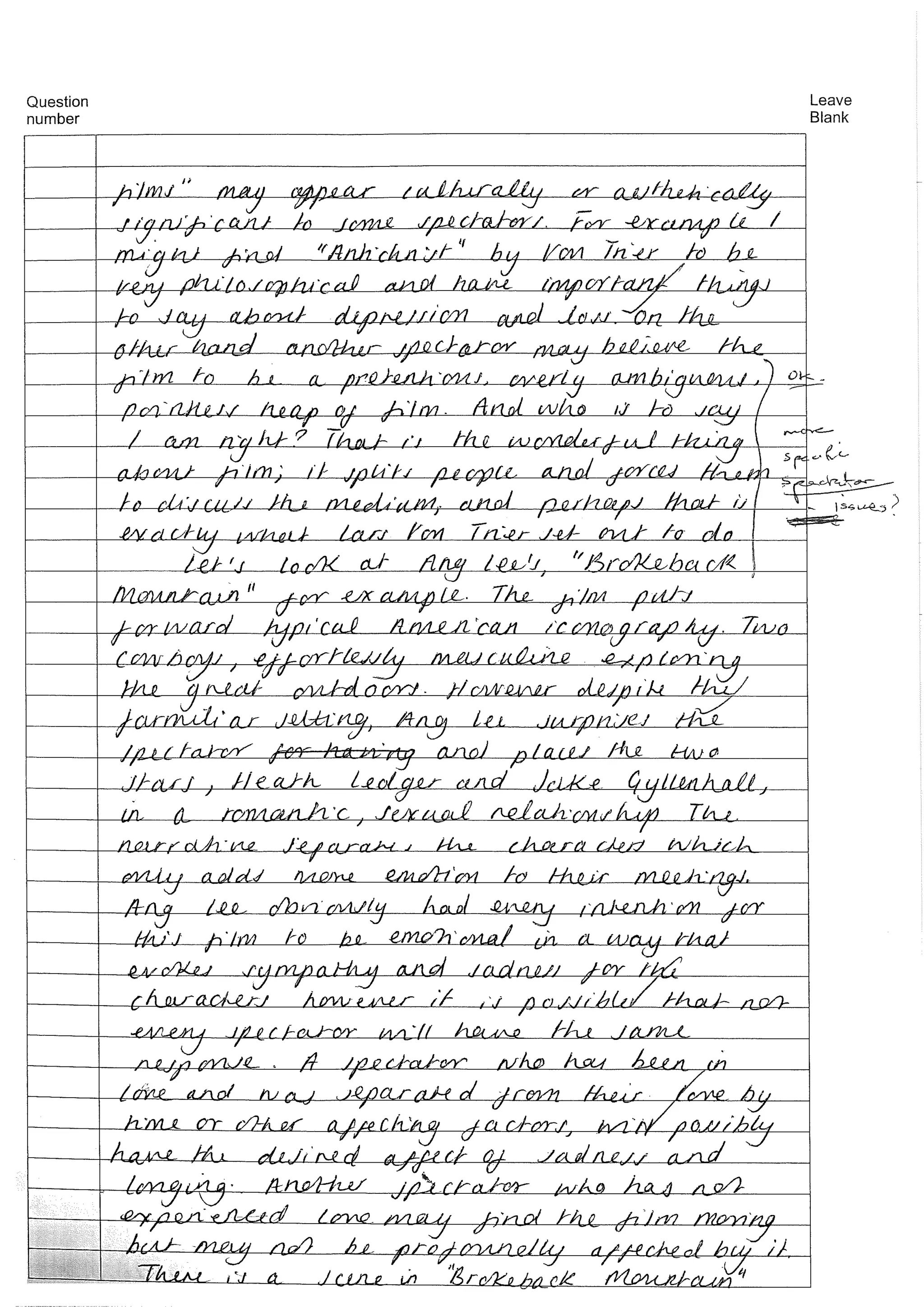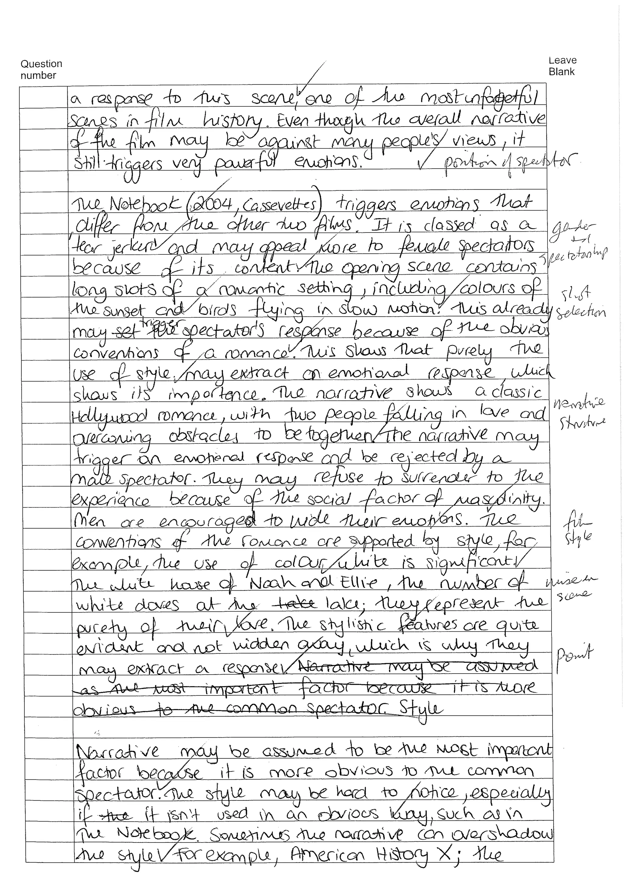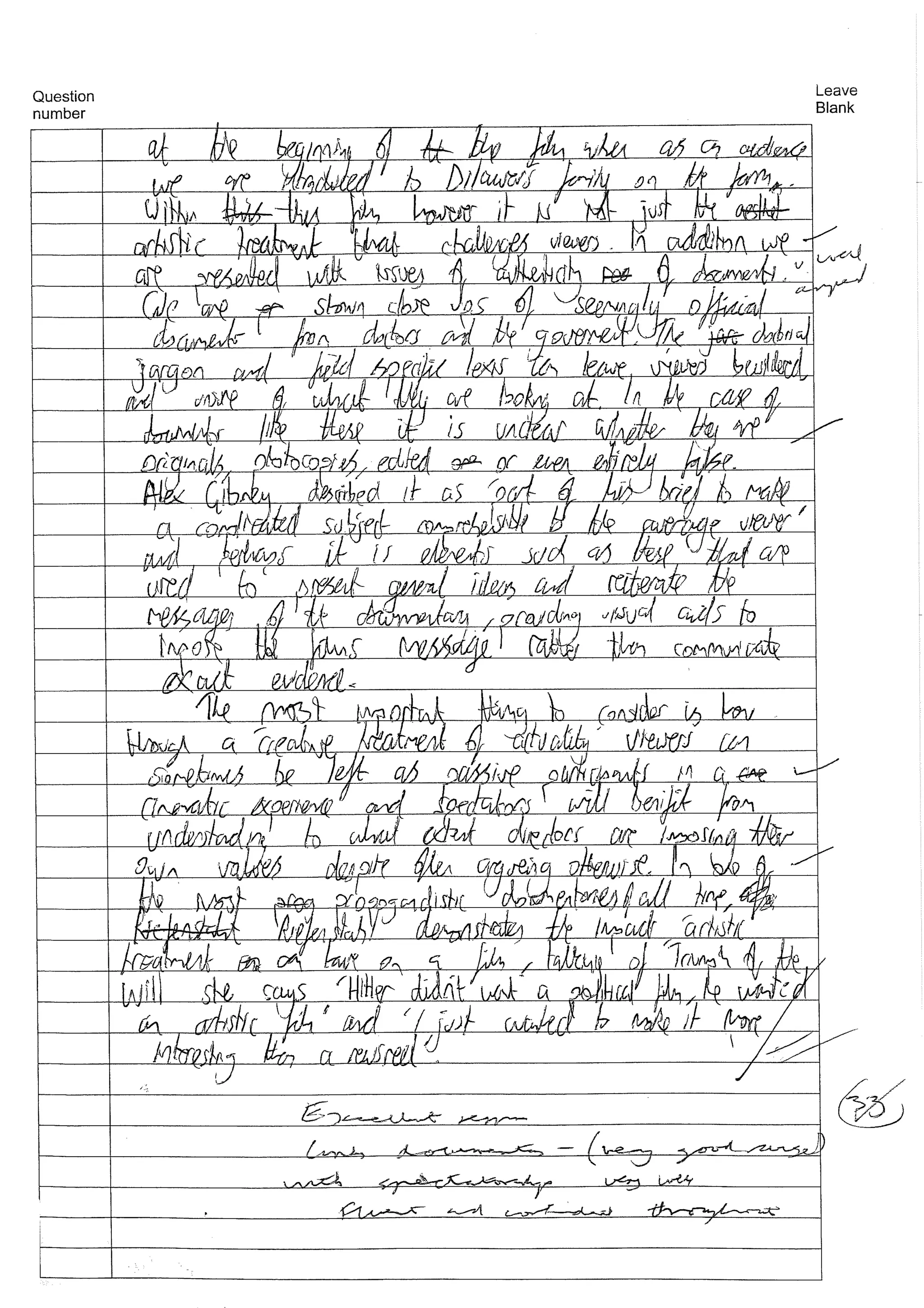 This document contains exemplar scripts from 8 candidates who took the GCE Film Studies exam. It provides a brief overview of each candidate's responses including the topics/films discussed in each section and their raw marks. The topics covered a wide range of film genres, movements and issues. Overall marks ranged from 86 to 96 and section marks were out of 35 for sections A and B, and 30 for section C. Grade boundaries for the exam are also provided.