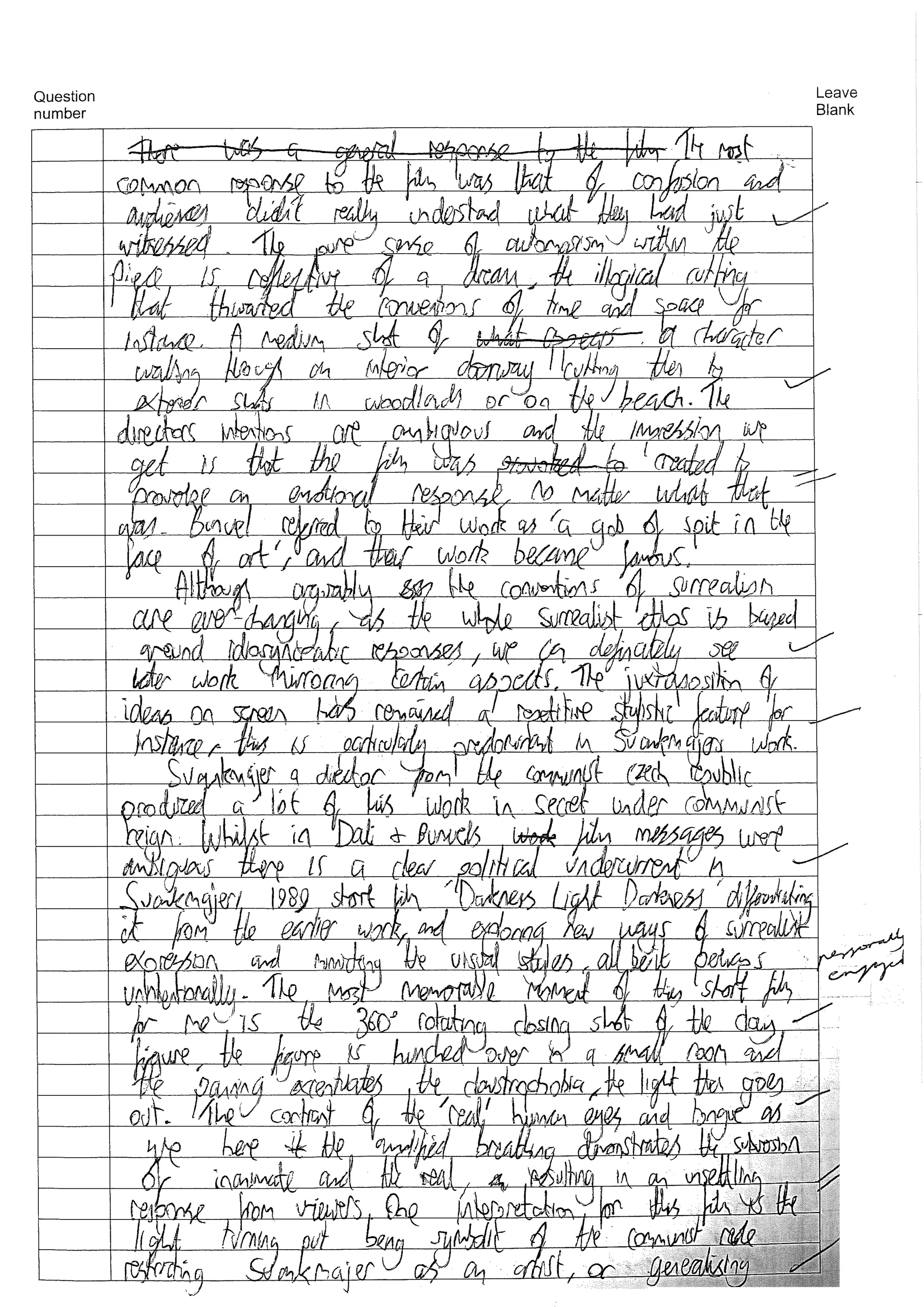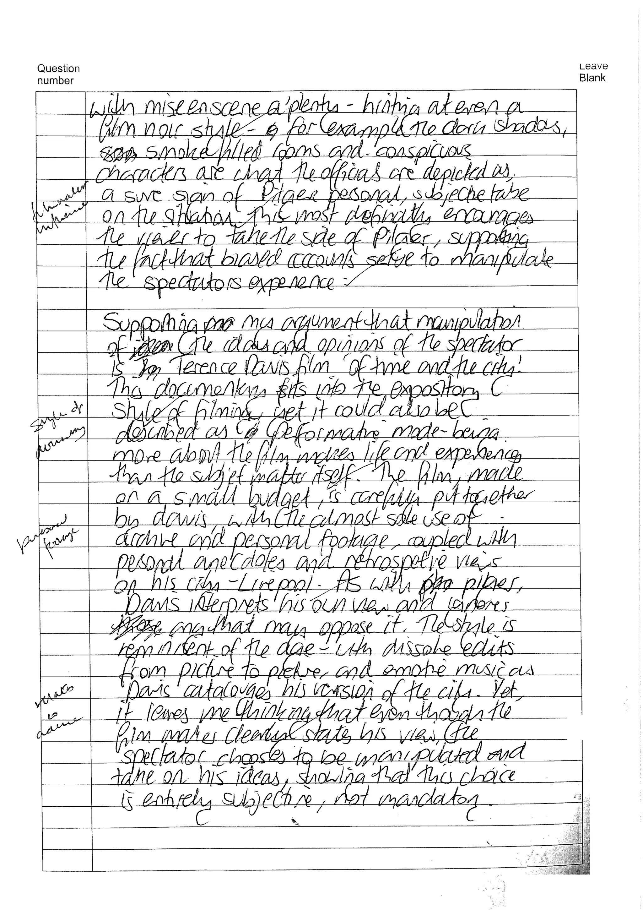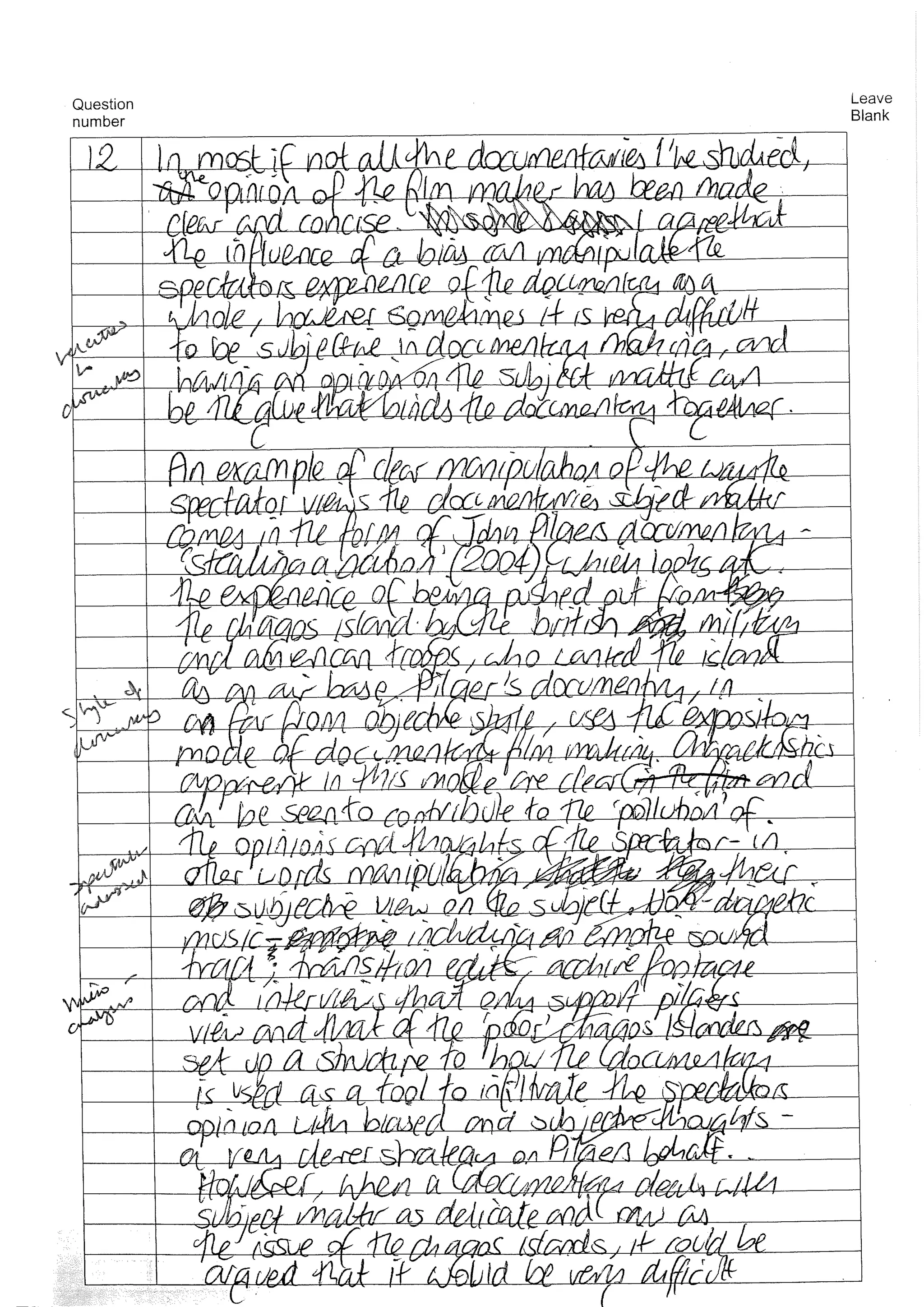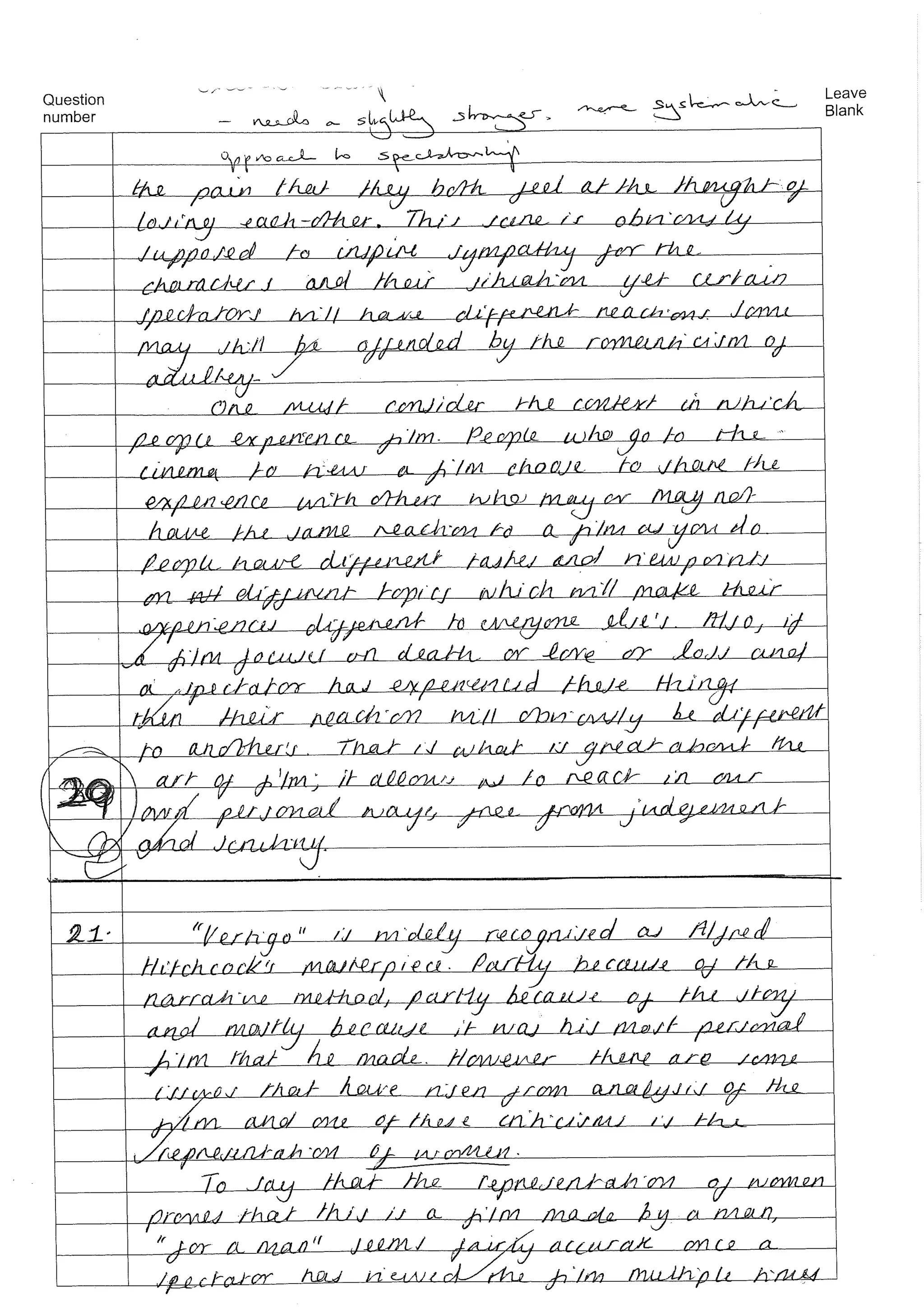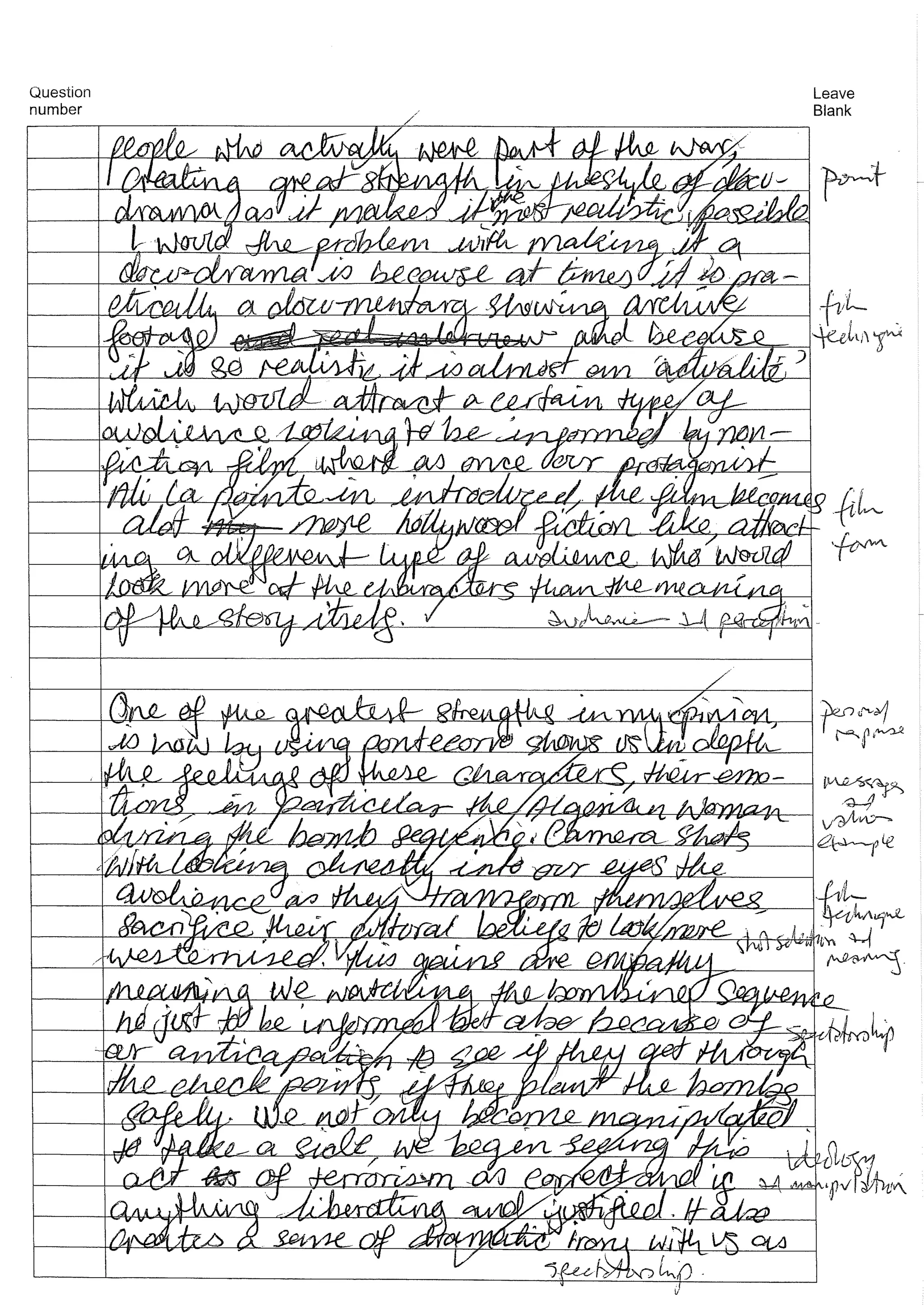 This document contains exemplar scripts from 8 candidates who took the GCE Film Studies exam. It provides a brief overview of each candidate's responses including the topics/films discussed in each section and their raw marks. The topics covered a wide range of film genres, movements and issues. Overall marks ranged from 86 to 96 and section marks were out of 35 for sections A and B, and 30 for section C. Grade boundaries for the exam are also provided.