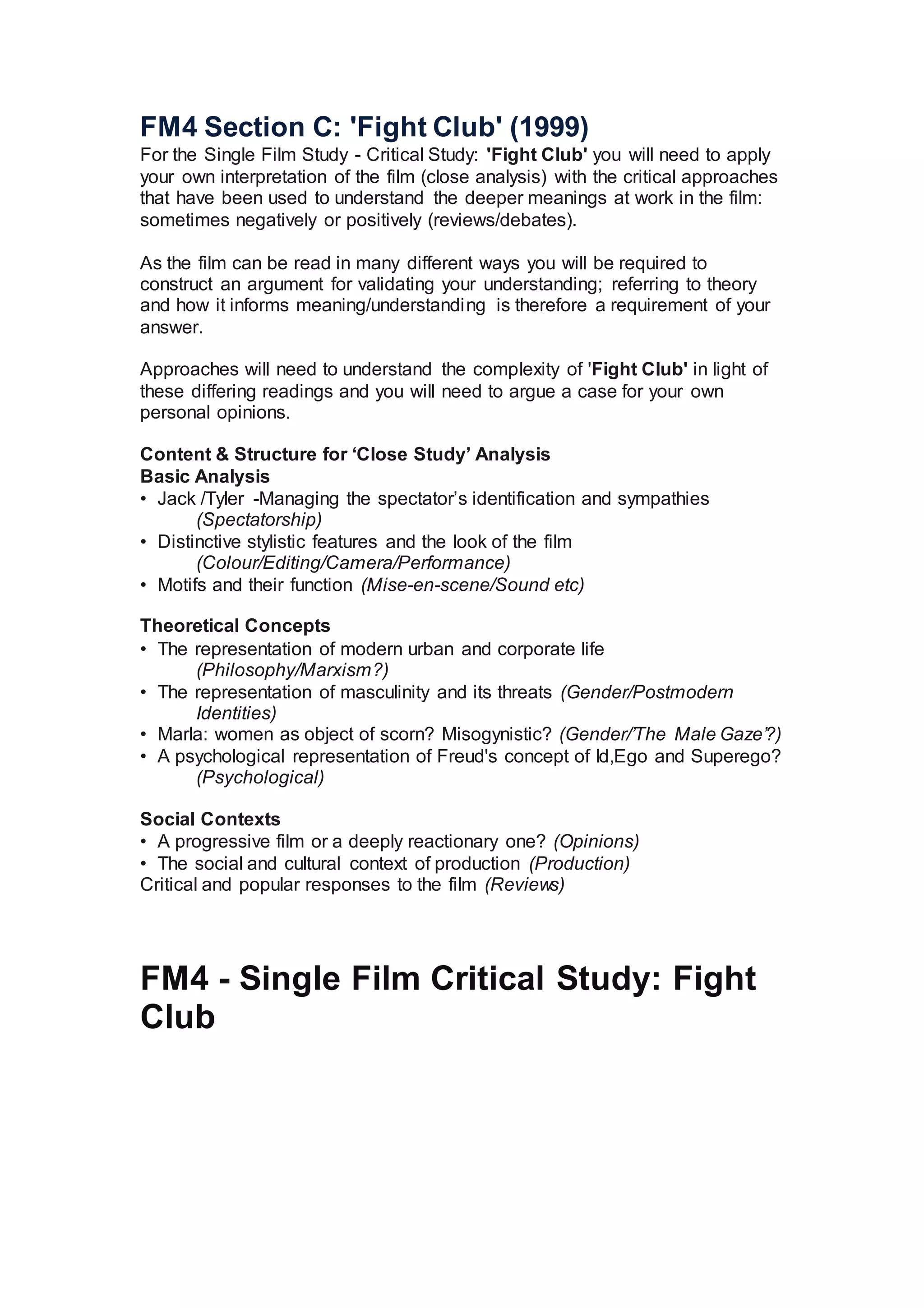The document provides guidance for writing a critical analysis of the film "Fight Club". It outlines theoretical concepts to discuss such as representations of modern life, masculinity, and gender. It also lists stylistic elements to analyze like color, editing, and performances. Students are instructed to construct an argument using film theory to support their own interpretation of the film's meanings and responses it has received.