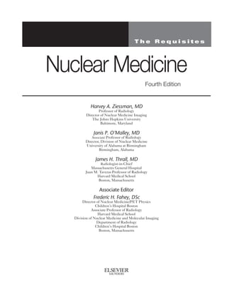 This document is the fourth edition of the textbook "Nuclear Medicine: The Requisites" by Harvey A. Ziessman, Janis P. O'Malley, and James H. Thrall, with Frederic H. Fahey as Associate Editor. The book provides an overview of nuclear medicine and is authored by experts in the field, including professors of radiology and directors of nuclear medicine programs at major hospitals and universities.